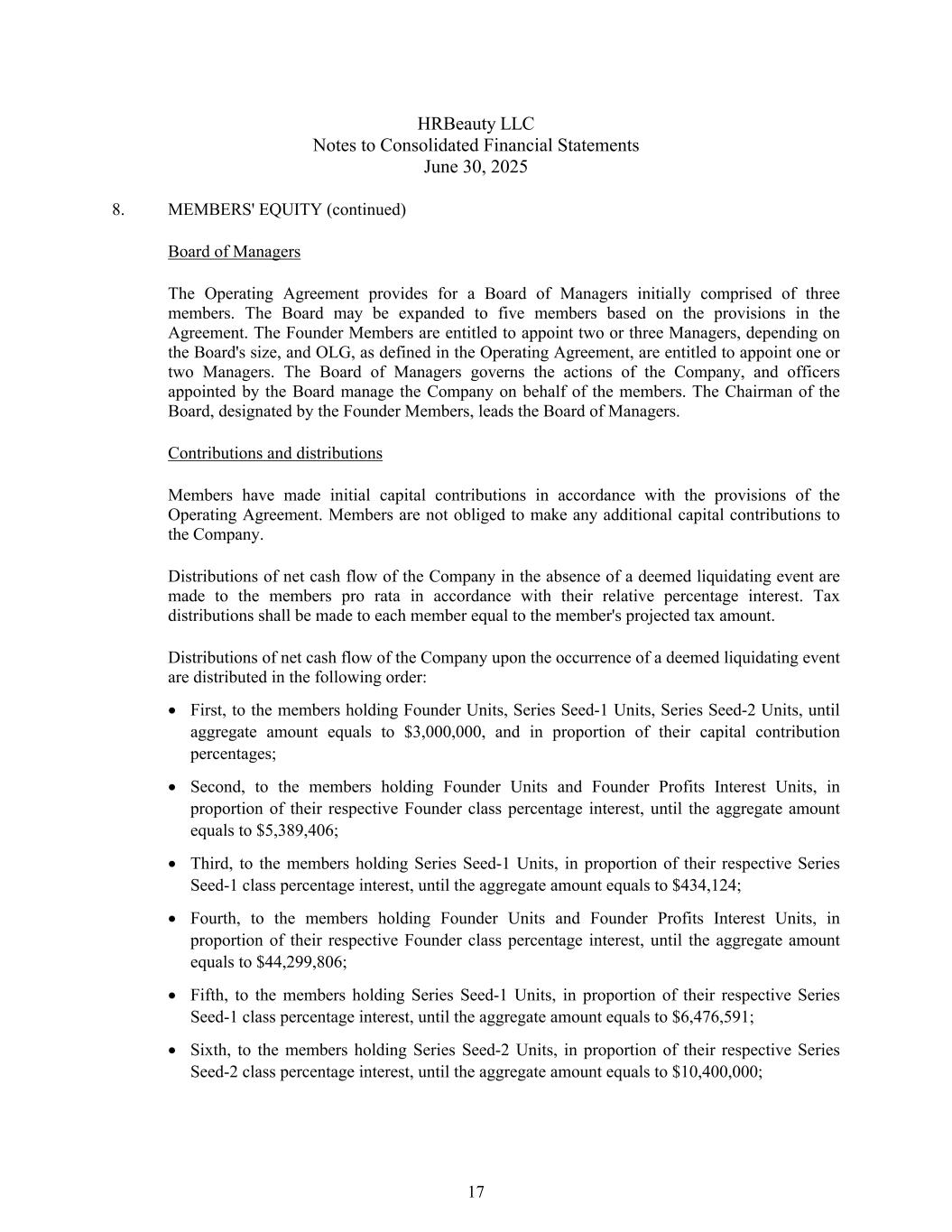 HRBeauty LLC Notes to Consolidated Financial Statements June 30, 2025 8. MEMBERS' EQUITY (continued) Board of Managers The Operating Agreement provides for a Board of Managers initially comprised of three members. The Board may be expanded to five members based on the provisions in the Agreement. The Founder Members are entitled to appoint two or three Managers, depending on the Board's size, and OLG, as defined in the Operating Agreement, are entitled to appoint one or two Managers. The Board of Managers governs the actions of the Company, and officers appointed by the Board manage the Company on behalf of the members. The Chairman of the Board, designated by the Founder Members, leads the Board of Managers. Contributions and distributions Members have made initial capital contributions in accordance with the provisions of the Operating Agreement. Members are not obliged to make any additional capital contributions to the Company. Distributions of net cash flow of the Company in the absence of a deemed liquidating event are made to the members pro rata in accordance with their relative percentage interest. Tax distributions shall be made to each member equal to the member's projected tax amount. Distributions of net cash flow of the Company upon the occurrence of a deemed liquidating event are distributed in the following order: First, to the members holding Founder Units, Series Seed-1 Units, Series Seed-2 Units, until aggregate amount equals to $3,000,000, and in proportion of their capital contribution percentages; Second, to the members holding Founder Units and Founder Profits Interest Units, in proportion of their respective Founder class percentage interest, until the aggregate amount equals to $5,389,406; Third, to the members holding Series Seed-1 Units, in proportion of their respective Series Seed-1 class percentage interest, until the aggregate amount equals to $434,124; Fourth, to the members holding Founder Units and Founder Profits Interest Units, in proportion of their respective Founder class percentage interest, until the aggregate amount equals to $44,299,806; Fifth, to the members holding Series Seed-1 Units, in proportion of their respective Series Seed-1 class percentage interest, until the aggregate amount equals to $6,476,591; Sixth, to the members holding Series Seed-2 Units, in proportion of their respective Series Seed-2 class percentage interest, until the aggregate amount equals to $10,400,000; 17