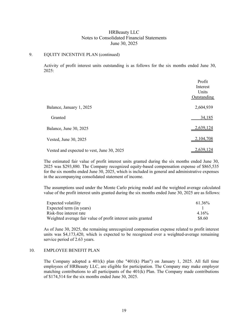 HRBeauty LLC Notes to Consolidated Financial Statements June 30, 2025 9. EQUITY INCENTIVE PLAN (continued) Activity of profit interest units outstanding is as follows for the six months ended June 30, 2025: Profit Interest Units Outstanding Balance, January 1, 2025 2,604,939 Granted 34,185 Balance, June 30, 2025 2,639,124 Vested, June 30, 2025 2,104,708 Vested and expected to vest, June 30, 2025 2,639,124 The estimated fair value of profit interest units granted during the six months ended June 30, 2025 was $293,880. The Company recognized equity-based compensation expense of $865,535 for the six months ended June 30, 2025, which is included in general and administrative expenses in the accompanying consolidated statement of income. The assumptions used under the Monte Carlo pricing model and the weighted average calculated value of the profit interest units granted during the six months ended June 30, 2025 are as follows: Expected volatility 61.36% Expected term (in years) 1 Risk-free interest rate 4.16% Weighted average fair value of profit interest units granted $8.60 As of June 30, 2025, the remaining unrecognized compensation expense related to profit interest units was $4,173,420, which is expected to be recognized over a weighted-average remaining service period of 2.63 years. 10. EMPLOYEE BENEFIT PLAN The Company adopted a 401(k) plan (the "401(k) Plan") on January 1, 2025. All full time employees of HRBeauty LLC, are eligible for participation. The Company may make employer matching contributions to all participants of the 401(k) Plan. The Company made contributions of $174,514 for the six months ended June 30, 2025. 19