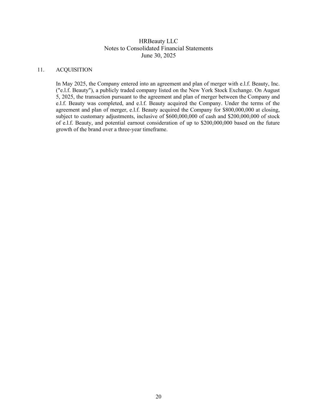 HRBeauty LLC Notes to Consolidated Financial Statements June 30, 2025 11. ACQUISITION In May 2025, the Company entered into an agreement and plan of merger with e.l.f. Beauty, Inc. ("e.l.f. Beauty"), a publicly traded company listed on the New York Stock Exchange. On August 5, 2025, the transaction pursuant to the agreement and plan of merger between the Company and e.l.f. Beauty was completed, and e.l.f. Beauty acquired the Company. Under the terms of the agreement and plan of merger, e.l.f. Beauty acquired the Company for $800,000,000 at closing, subject to customary adjustments, inclusive of $600,000,000 of cash and $200,000,000 of stock of e.l.f. Beauty, and potential earnout consideration of up to $200,000,000 based on the future growth of the brand over a three-year timeframe. 20
