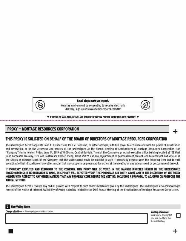 Small steps make an impact. Help the environment by consenting to receive electronic delivery, sign up at www.envisionreports.com/MR • IF VOTING BY MAIL, SIGN, DETACH AND RETURN THE BOTTOM PORTION IN THE ENCLOSED ENVELOPE. • PROXY — MONTAGE RESOURCES CORPORATION + THIS PROXY IS SOLICITED ON BEHALF OF THE BOARD OF DIRECTORS OF MONTAGE RESOURCES CORPORATION The undersigned hereby appoints John K. Reinhart and Paul M. Johnston, or either of them, with full power to act alone and with full power of substitution and revocation, to be the attorneys and proxies of the undersigned at the Annual Meeting of Stockholders of Montage Resources Corporation (the “Company”) to be held on Friday, June 14, 2019 at 10:00 a.m. Central Daylight Time, at the Company’s principal executive office building located at 122 West John Carpenter Freeway, 1st Floor Conference Center, Irving, Texas 75039, and any adjournment or postponement thereof, and to represent and vote all of the shares of common stock of the Company that the undersigned would be entitled to vote if personally present upon the following item and to vote according to their discretion on any other matter that may properly be presented for action at the meeting or any adjournment or postponement thereof: IF PROPERLY EXECUTED AND RETURNED TO THE COMPANY, THIS PROXY WILL BE VOTED IN THE MANNER DIRECTED HEREIN BY THE UNDERSIGNED STOCKHOLDER(S). IF NO DIRECTION IS MADE, THIS PROXY WILL BE VOTED “FOR” THE PROPOSALS SET FORTH ABOVE AND IN THE DISCRETION OF THE PROXY HOLDER WITH RESPECT TO ANY OTHER MATTERS THAT MAY PROPERLY COME BEFORE THE MEETING, INCLUDING A PROPOSAL TO ADJOURN OR POSTPONE THE ANNUAL MEETING. The undersigned hereby revokes any and all proxies with respect to such shares heretofore given by the undersigned. The undersigned also acknowledges receipt of the Notice of Internet Availability of Proxy Materials related to the 2019 Annual Meeting of the Stockholders of Montage Resources Corporation. Non-Voting Items C Change of Address — Please print new address below. Meeting Attendance Mark box to the right if you plan to attend the Annual Meeting. +