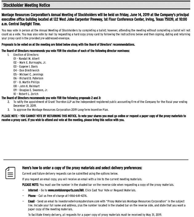 Here’s how to order a copy of the proxy materials and select delivery preferences: Current and future delivery requests can be submitted using the options below. If you request an email copy, you will receive an email with a link to the current meeting materials. PLEASE NOTE: You must use the number in the shaded bar on the reverse side when requesting a copy of the proxy materials. — Internet – Go to www.envisionreports.com/MR. Click Cast Your Vote or Request Materials. — Phone – Call us free of charge at 1-866-641-4276. — Email – Send an email to investorvote@computershare.com with “Proxy Materials Montage Resources Corporation” in the subject line. Include your full name and address, plus the number located in the shaded bar on the reverse side, and state that you want a paper copy of the meeting materials. To facilitate timely delivery, all requests for a paper copy of proxy materials must be received by May 31, 2019. Montage Resources Corporation’s Annual Meeting of Stockholders will be held on Friday, June 14, 2019 at the Company’s principal executive office building located at 122 West John Carpenter Freeway, 1st Floor Conference Center, Irving, Texas 75039, at 10:00 a.m. Central Daylight Time. You may vote in person at the Annual Meeting of Stockholders by completing a ballot; however, attending the meeting without completing a ballot will not count as a vote. You may also vote by mail by requesting a hard copy proxy card by following the instructions below and then signing, dating and returning your proxy card in the provided pre-addressed envelope. Proposals to be voted on at the meeting are listed below along with the Board of Directors’ recommendations. The Board of Directors recommends you vote FOR the election of each of the following director nominees: 1. Election of Directors: 01 – Randall M. Albert 02 – Mark E. Burroughs, Jr. 03 – Eugene I. Davis 04 – Don Dimitrievich 05 – Michael C. Jennings 06 – Richard D. Paterson 07 – D. Martin Phillips 08 – John K. Reinhart 09 – Douglas E. Swanson, Jr. 10 – Robert L. Zorich The Board of Directors recommends you vote FOR the following proposals 2 and 3: 2. To ratify the appointment of Grant Thornton LLP as the independent registered public accounting firm of the Company for the fiscal year ending December 31, 2019. 3. To approve the Montage Resources Corporation 2019 Long-Term Incentive Plan. PLEASE NOTE – YOU CANNOT VOTE BY RETURNING THIS NOTICE. To vote your shares you must go online or request a paper copy of the proxy materials to receive a proxy card. If you wish to attend and vote at the meeting, please bring this notice with you. Stockholder Meeting Notice
