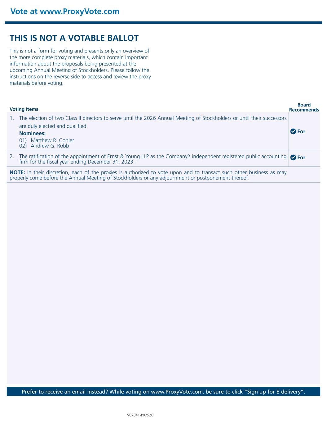 THIS IS NOT A VOTABLE BALLOT This is not a form for voting and presents only an overview of the more complete proxy materials, which contain important information about the proposals being presented at the upcoming Annual Meeting of Stockholders. Please follow the instructions on the reverse side to access and review the proxy materials before voting. Vote at www.ProxyVote.com Prefer to receive an email instead? While voting on www.ProxyVote.com, be sure to click “Sign up for E-delivery”. Voting Items Board Recommends V07341-P87526 01) Matthew R. Cohler 02) Andrew G. Robb 1. The election of two Class II directors to serve until the 2026 Annual Meeting of Stockholders or until their successors are duly elected and qualified. Nominees: For For2. The ratification of the appointment of Ernst & Young LLP as the Company’s independent registered public accounting firm for the fiscal year ending December 31, 2023. NOTE: In their discretion, each of the proxies is authorized to vote upon and to transact such other business as may properly come before the Annual Meeting of Stockholders or any adjournment or postponement thereof.