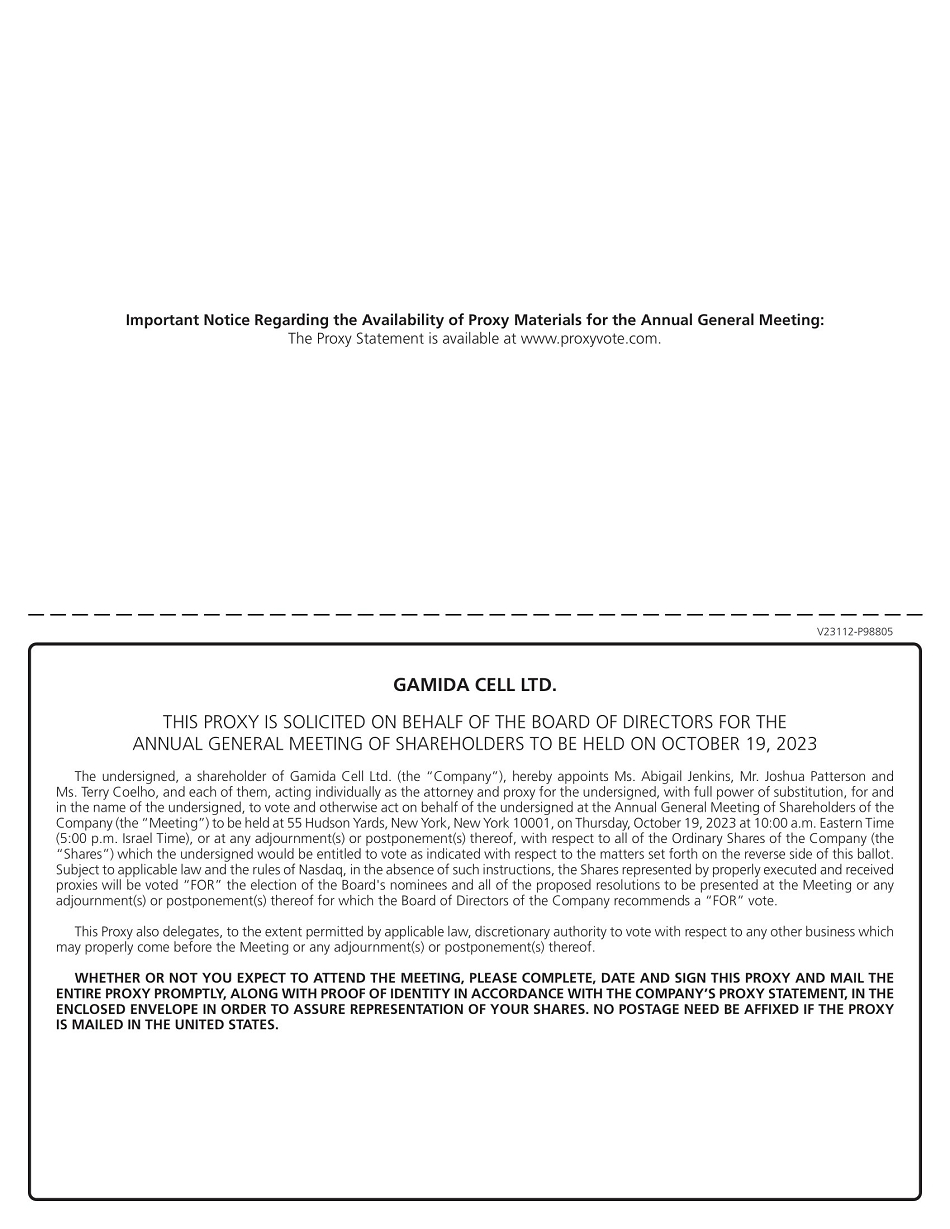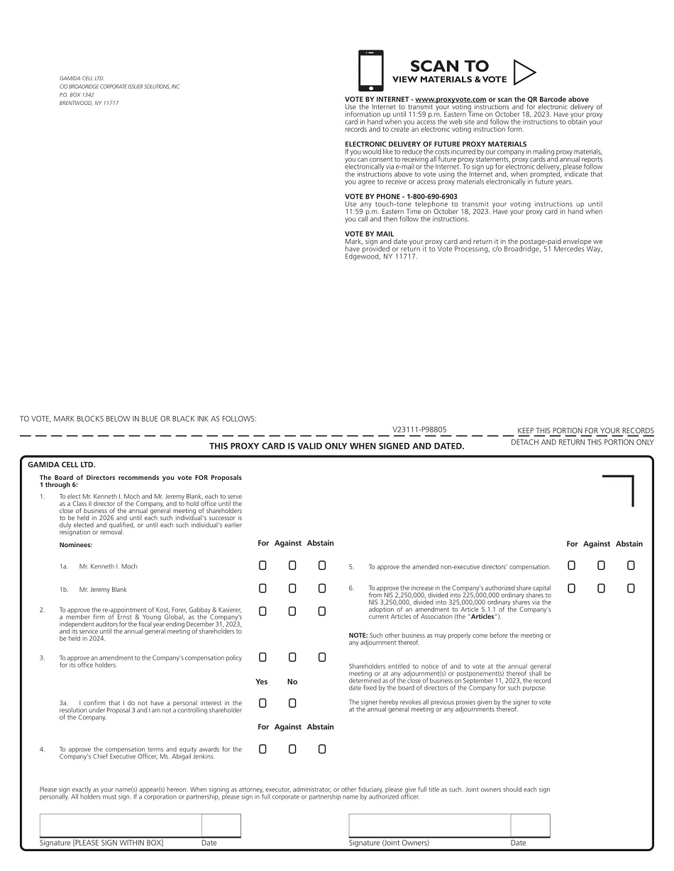 With approximately one week remaining to vote your proxy, if we have not yet received your voting instructions for the Annual General Meeting of Shareholders of Gamida Cell Ltd. to be held on Thursday, October 19, 2023, please vote today. Your vote is extremely important, no matter how many shares you hold.