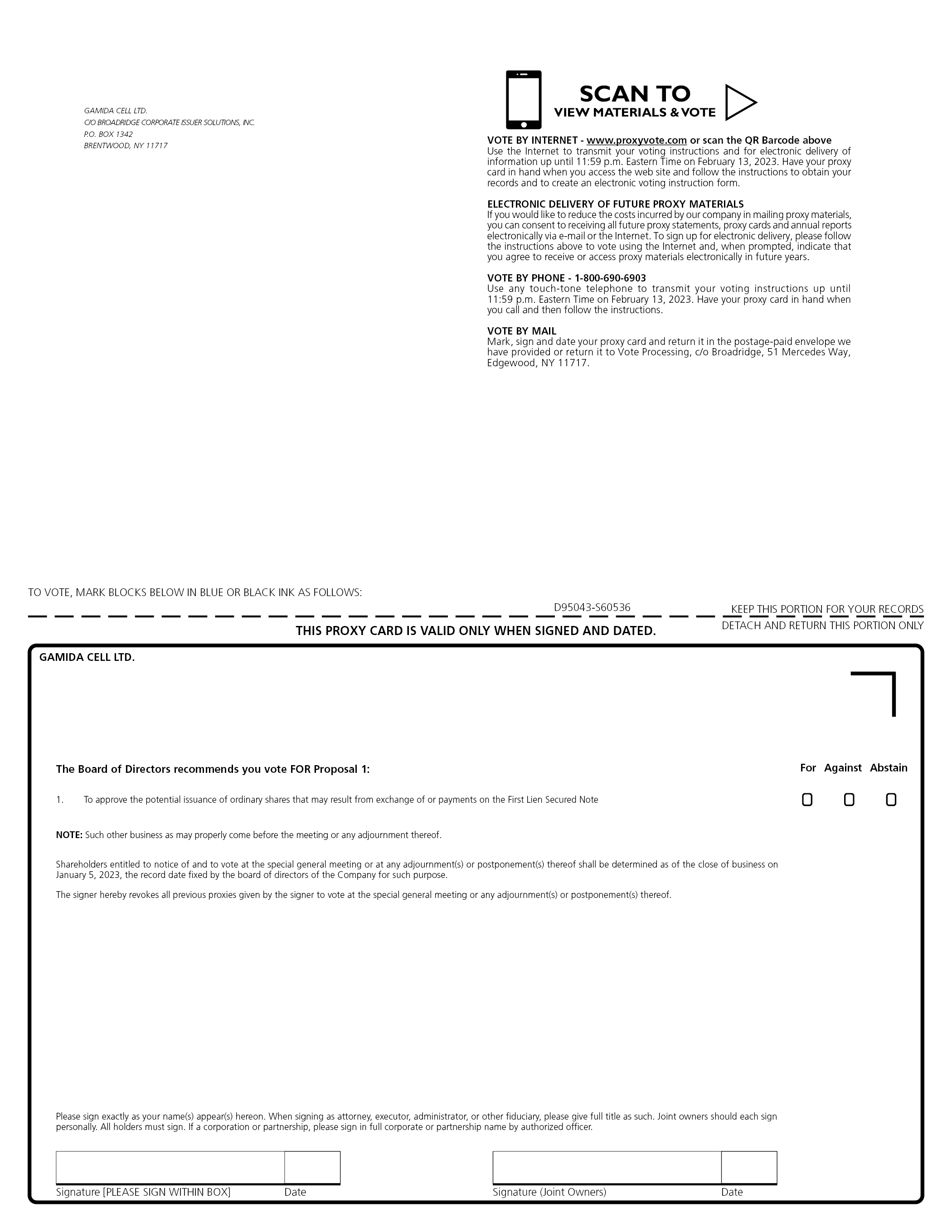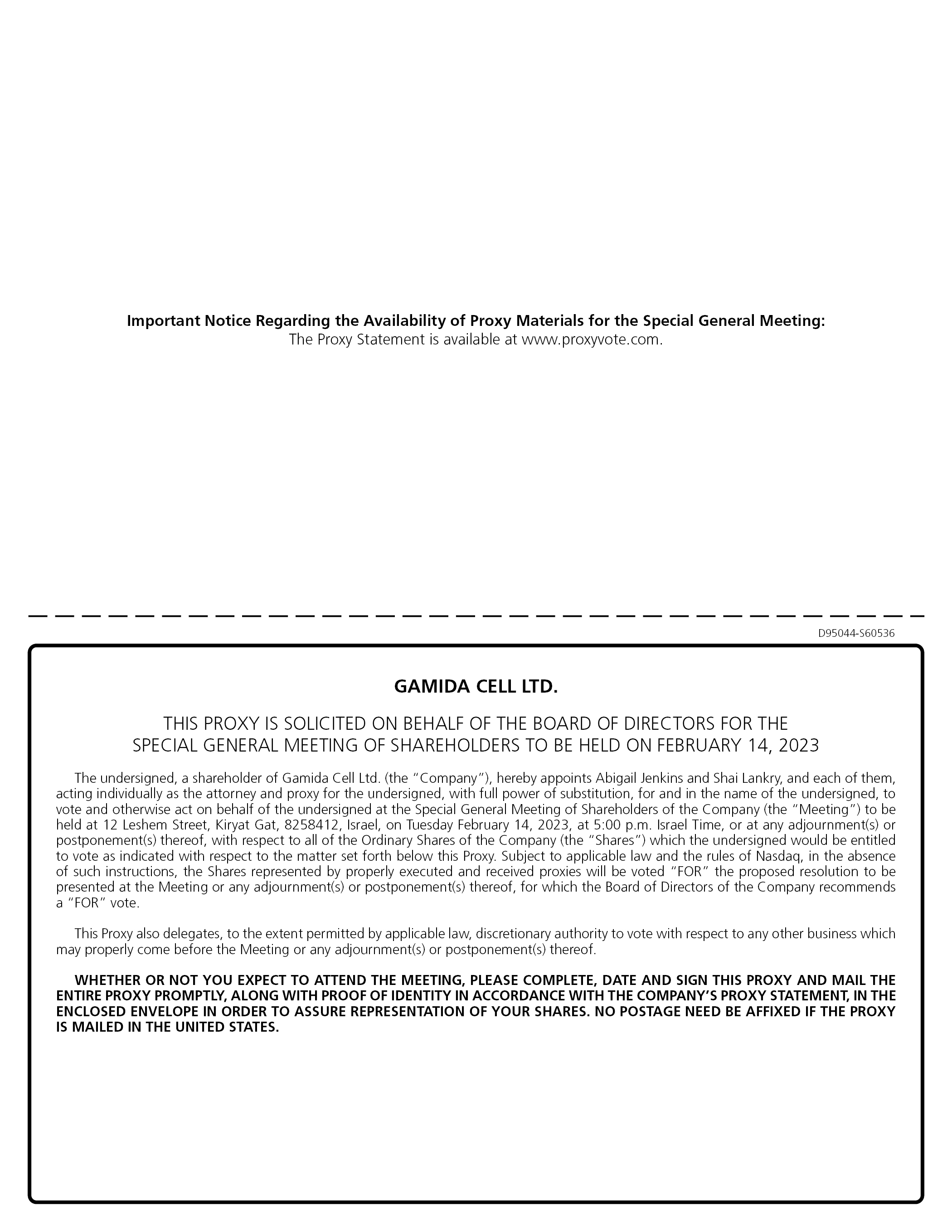 Important Notice Regarding the Availability of Proxy Materials for the Special General Meeting: The Proxy Statement is available at www.proxyvote.com. D95044-S60536 GAMIDA CELL LTD. THIS PROXY IS SOLICITED ON BEHALF OF THE BOARD OF DIRECTORS FOR THE SPECIAL GENERAL MEETING OF SHAREHOLDERS TO BE HELD ON FEBRUARY 14, 2023 The undersigned, a shareholder of Gamida Cell Ltd. (the “Company”), hereby appoints Abigail Jenkins and Shai Lankry, and each of them, acting individually as the attorney and proxy for the undersigned, with full power of substitution, for and in the name of the undersigned, to vote and otherwise act on behalf of the undersigned at the Special General Meeting of Shareholders of the Company (the “Meeting”) to be held at 12 Leshem Street, Kiryat Gat, 8258412, Israel, on Tuesday February 14, 2023, at 5:00 p.m. Israel Time, or at any adjournment(s) or postponement(s) thereof, with respect to all of the Ordinary Shares of the Company (the “Shares”) which the undersigned would be entitled to vote as indicated with respect to the matter set forth below this Proxy. Subject to applicable law and the rules of Nasdaq, in the absence of such instructions, the Shares represented by properly executed and received proxies will be voted “FOR” the proposed resolution to be presented at the Meeting or any adjournment(s) or postponement(s) thereof, for which the Board of Directors of the Company recommends a “FOR” vote. This Proxy also delegates, to the extent permitted by applicable law, discretionary authority to vote with respect to any other business which may properly come before the Meeting or any adjournment(s) or postponement(s) thereof. WHETHER OR NOT YOU EXPECT TO ATTEND THE MEETING, PLEASE COMPLETE, DATE AND SIGN THIS PROXY AND MAIL THE ENTIRE PROXY PROMPTLY, ALONG WITH PROOF OF IDENTITY IN ACCORDANCE WITH THE COMPANY’S PROXY STATEMENT, IN THE ENCLOSED ENVELOPE IN ORDER TO ASSURE REPRESENTATION OF YOUR SHARES. NO POSTAGE NEED BE AFFIXED IF THE PROXY IS MAILED IN THE UNITED STATES.