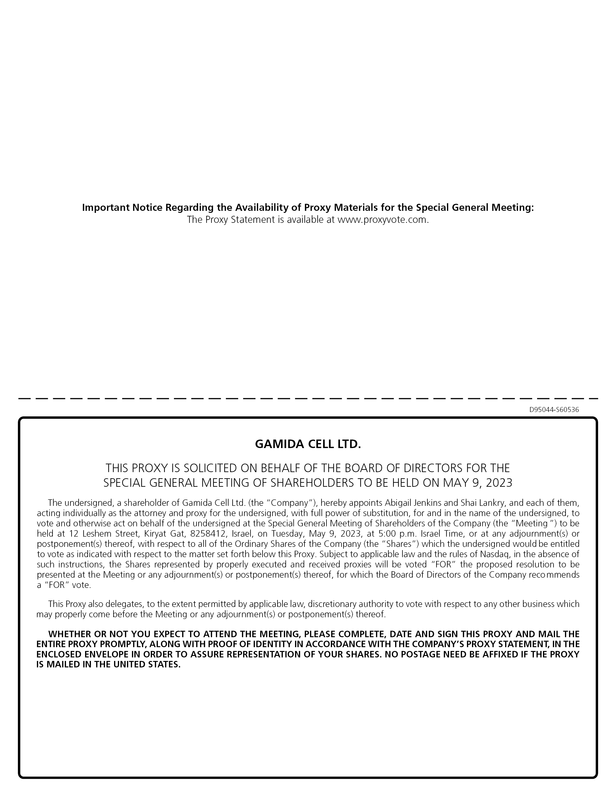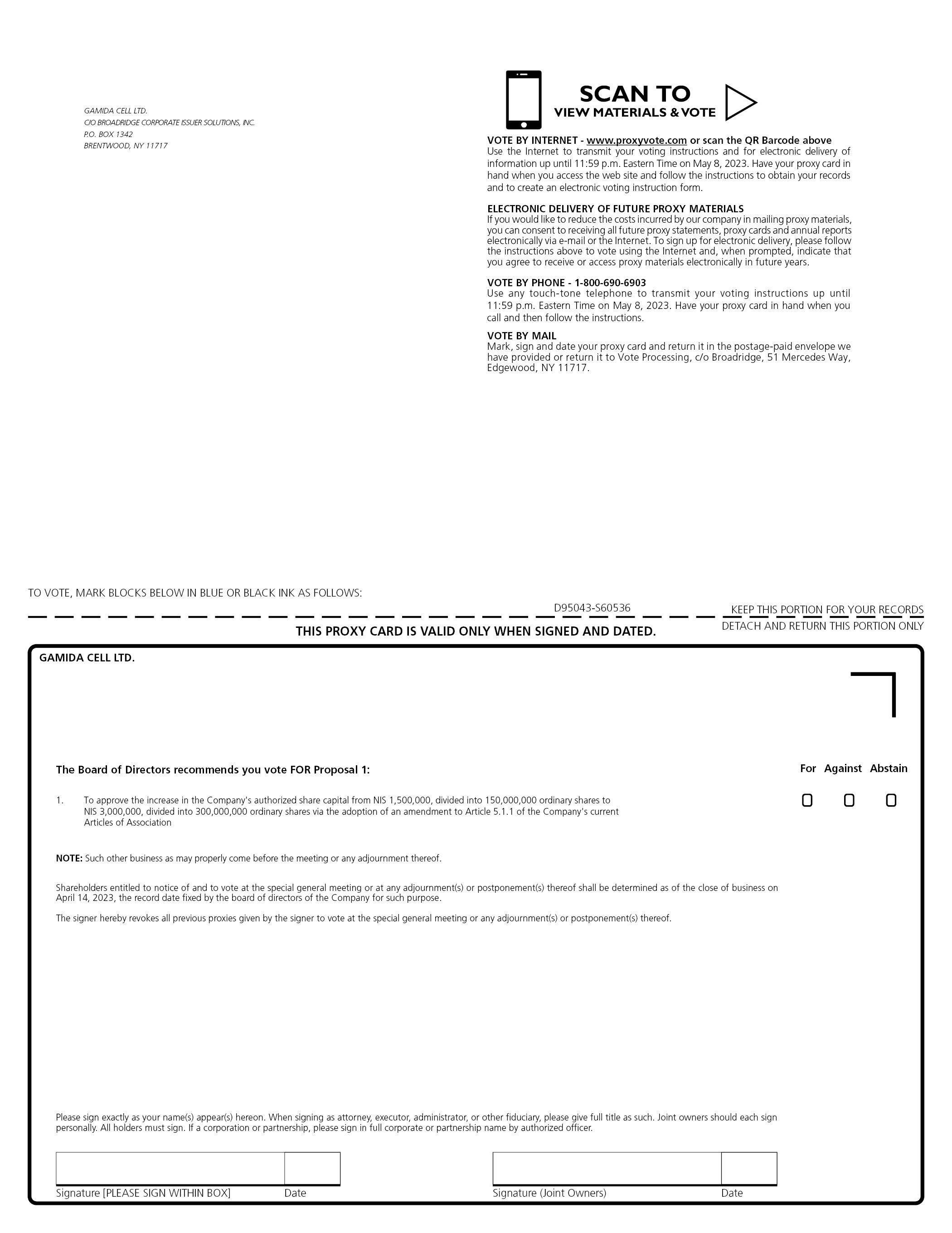 GAMIDA CELL LTD. C/O BROADRIDGE CORPORATE ISSUER SOLUTIONS, INC. P.O. BOX 1342 BRENTWOOD, NY 11717 SCAN TO VIEW MATERIALS &VOTE VOTE BY INTERNET - www.proxyvote.com or scan the QR Barcode above Use the Internet to transmit your voting instructions and for electronic delivery of information up until 11:59 p.m. Eastern Time on May 8, 2023. Have your proxy card in hand when you access the web site and follow the instructions to obtain your records and to create an electronic voting instruction form. ELECTRONIC DELIVERY OF FUTURE PROXY MATERIALS If youwould like to reduce the costs incurred by our company in mailing proxy materials, you can consent to receiving all future proxy statements, proxy cards and annual reports electronically via e-mail or the Internet. To sign up for electronic delivery, please follow the instructions above to vote using the Internet and, when prompted, indicate that you agree to receive or access proxy materials electronically in future years. VOTE BY PHONE - 1-800-690-6903 Use any touch-tone telephone to transmit your voting instructions up until 11:59 p.m. Eastern Time on May 8, 2023. Have your proxy card in hand when you call and then follow the instructions. VOTE BY MAIL Mark, sign and date your proxy card and return it in the postage-paid envelope we have provided or return it to Vote Processing, c/o Broadridge, 51 Mercedes Way, Edgewood, NY 11717. TO VOTE, MARK BLOCKS BELOW IN BLUE OR BLACK INK AS FOLLOWS: D95043-S60536 KEEP THIS PORTION FOR YOUR RECORDS THIS PROXY CARD IS VALID ONLY WHEN SIGNED AND DATED. DETACH AND RETURN THIS PORTION ONLY GAMIDA CELL LTD. The Board of Directors recommends you vote FOR Proposal 1: To approve the increase in the Company’s authorized share capital from NIS 1,500,000, divided into 150,000,000 ordinary shares to NIS 3,000,000, divided into 300,000,000 ordinary shares via the adoption of an amendment to Article 5.1.1 of the Company’s current Articles of Association NOTE: Such other business as may properly come before the meeting or any adjournment thereof. Shareholders entitled to notice of and to vote at the special general meeting or at any adjournment(s) or postponement(s) thereof shall be determined as of the close of business on April 14, 2023, the record date fixed by the board of directors of the Company for such purpose. The signer hereby revokes all previous proxies given by the signer to vote at the special general meeting or any adjournment(s) or postponement(s) thereof. For Against Abstain Please sign exactly as your name(s) appear(s) hereon. When signing as attorney, executor, administrator, or other fiduciary, please give full title as such. Joint owners should each sign personally. All holders must sign. If a corporation or partnership, please sign in full corporate or partnership name by authorized officer. Signature [PLEASE SIGN WITHIN BOX] Date Signature (Joint Owners) Date