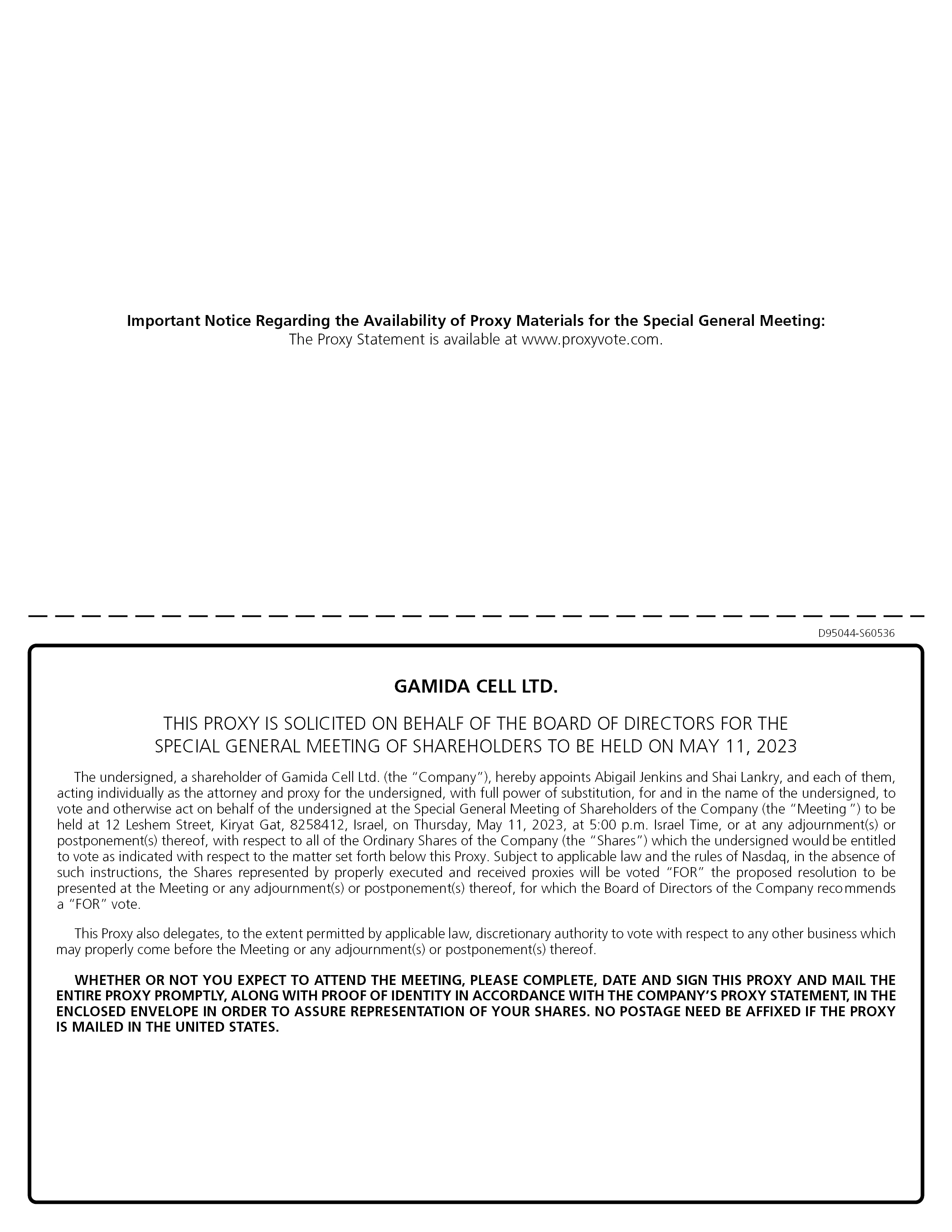 Important Notice Regarding the Availability of Proxy Materials for the Special General Meeting: The Proxy Statement is available at www.proxyvote.com. D95044-S60536 GAMIDA CELL LTD. THIS PROXY IS SOLICITED ON BEHALF OF THE BOARD OF DIRECTORS FOR THE SPECIAL GENERAL MEETING OF SHAREHOLDERS TO BE HELD ON MAY 11, 2023 The undersigned, a shareholder of Gamida Cell Ltd. (the “Company”), hereby appoints Abigail Jenkins and Shai Lankry, and each of them, acting individually as the attorney and proxy for the undersigned, with full power of substitution, for and in the name of the undersigned, to vote and otherwise act on behalf of the undersigned at the Special General Meeting of Shareholders of the Company (the “Meeting”) to be held at 12 Leshem Street, Kiryat Gat, 8258412, Israel, on Thursday, May 11, 2023, at 5:00 p.m. Israel Time, or at any adjournment(s) or postponement(s) thereof, with respect to all of the Ordinary Shares of the Company (the “Shares”) which the undersigned would be entitled to vote as indicated with respect to the matter set forth below this Proxy. Subject to applicable law and the rules of Nasdaq, in the absence of such instructions, the Shares represented by properly executed and received proxies will be voted “FOR” the proposed resolution to be presented at the Meeting or any adjournment(s) or postponement(s) thereof, for which the Board of Directors of the Company recommends a “FOR” vote. This Proxy also delegates, to the extent permitted by applicable law, discretionary authority to vote with respect to any other business which may properly come before the Meeting or any adjournment(s) or postponement(s) thereof. WHETHER OR NOT YOU EXPECT TO ATTEND THE MEETING, PLEASE COMPLETE, DATE AND SIGN THIS PROXY AND MAIL THE ENTIRE PROXY PROMPTLY, ALONG WITH PROOF OF IDENTITY IN ACCORDANCE WITH THE COMPANY’S PROXY STATEMENT, IN THE ENCLOSED ENVELOPE IN ORDER TO ASSURE REPRESENTATION OF YOUR SHARES. NO POSTAGE NEED BE AFFIXED IF THE PROXY IS MAILED IN THE UNITED STATES.