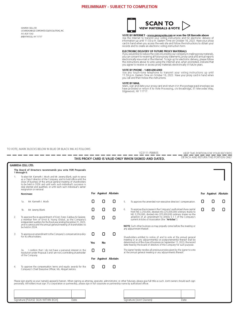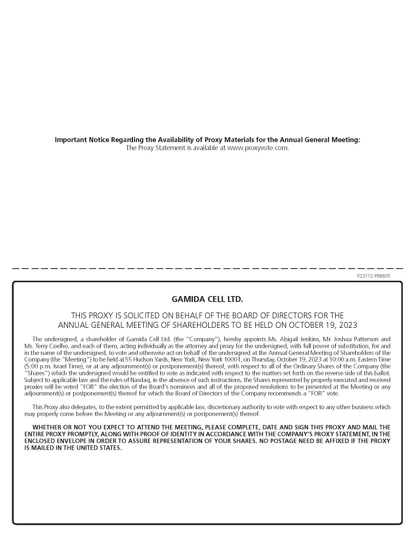 A proxy statement describing the various matters to be voted upon at the Meeting along with a proxy card enabling the shareholders to indicate their vote on each matter accompanies this Notice of Annual General Meeting of Shareholders. These materials will be mailed on or about September 20, 2023 to all shareholders entitled to participate in and vote at the Meeting, and they are available on the Company’s website at https://investors.gamida-cell.com/financials-filings/sec-filings. Proxies voted electronically must be submitted to the Company or to its transfer agent no later than midnight on the night prior to the Meeting. After such time, a shareholder must be present in person to vote their shares. If your ordinary shares in the Company are held in “street name” (meaning held through a bank, broker or other nominee), you will be able to either direct the record holder of your shares on how to vote your shares or obtain a legal proxy from the record holder that enables you to participate in and to vote your shares at the Meeting (or to appoint a proxy to do so).