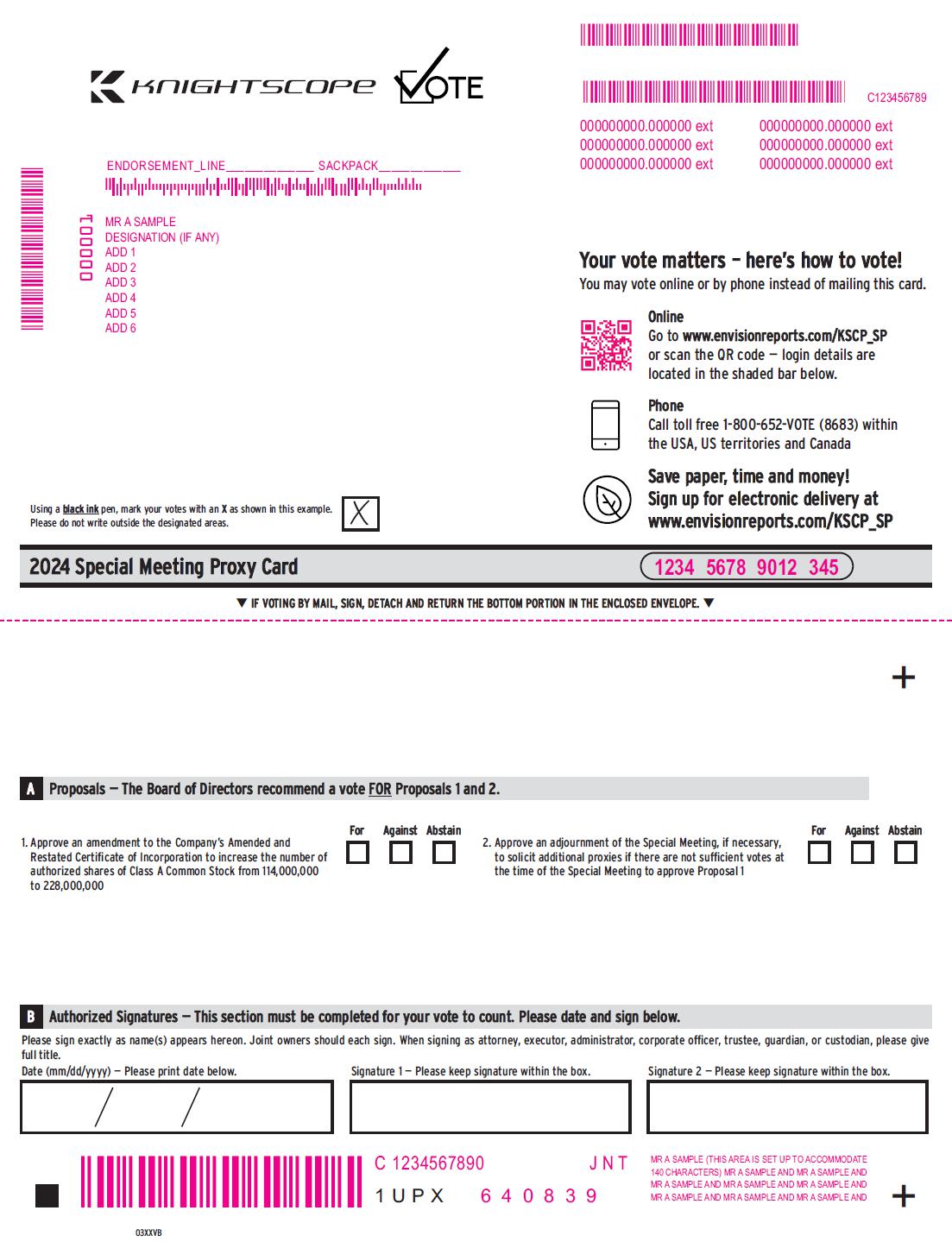Your vote matters - here's how to vote! You may vote online or by phone instead of mailing this card. Online Go to www.envisionreports.com/KSCP_SP or scan the QR code - login details are located in the shaded bar below. Save paper, time and money! Sign up for electronic delivery at www.envisionreports.com/KSCP_SP Phone Call toll free 1-800-652-VOTE (8683) within the USA, US territories and Canada Using a black ink pen, mark your votes with an X as shown in this example. Please do not write outside the designated areas. 2024 Special Meeting Proxy Card 1234 5678 9012 345 IF VOTING BY MAIL, SIGN, DETACH AND RETURN THE BOTTOM PORTION IN THE ENCLOSED ENVELOPE. A Proposals - The Board of Directors recommend A a vote FOR Proposals 1 and 2. 1. Approve an amendment to the Company's Amended and Restated Certificate of Incorporation to increase the number of authorized shares of Class A Common Stock from 114,000,000 to 228,000,000 2. Approve an adjournment of the Special Meeting, if necessary, to solicit additional proxies if there are not sufficient votes at the time of the Special Meeting to approve Proposal 1 B Authorized Signatures - This section must be completed for your vote to count. Please date and sign below. Please sign exactly as name(s) appears hereon. Joint owners should each sign. When signing as attorney, executor, administrator, corporate officer, trustee, guardian, or custodian, please give full title. Date (mm/dd/yyyy) - Please print date below. Signature 1 - Please keep signature within the box. Signature 2 - Please keep signature within the box.