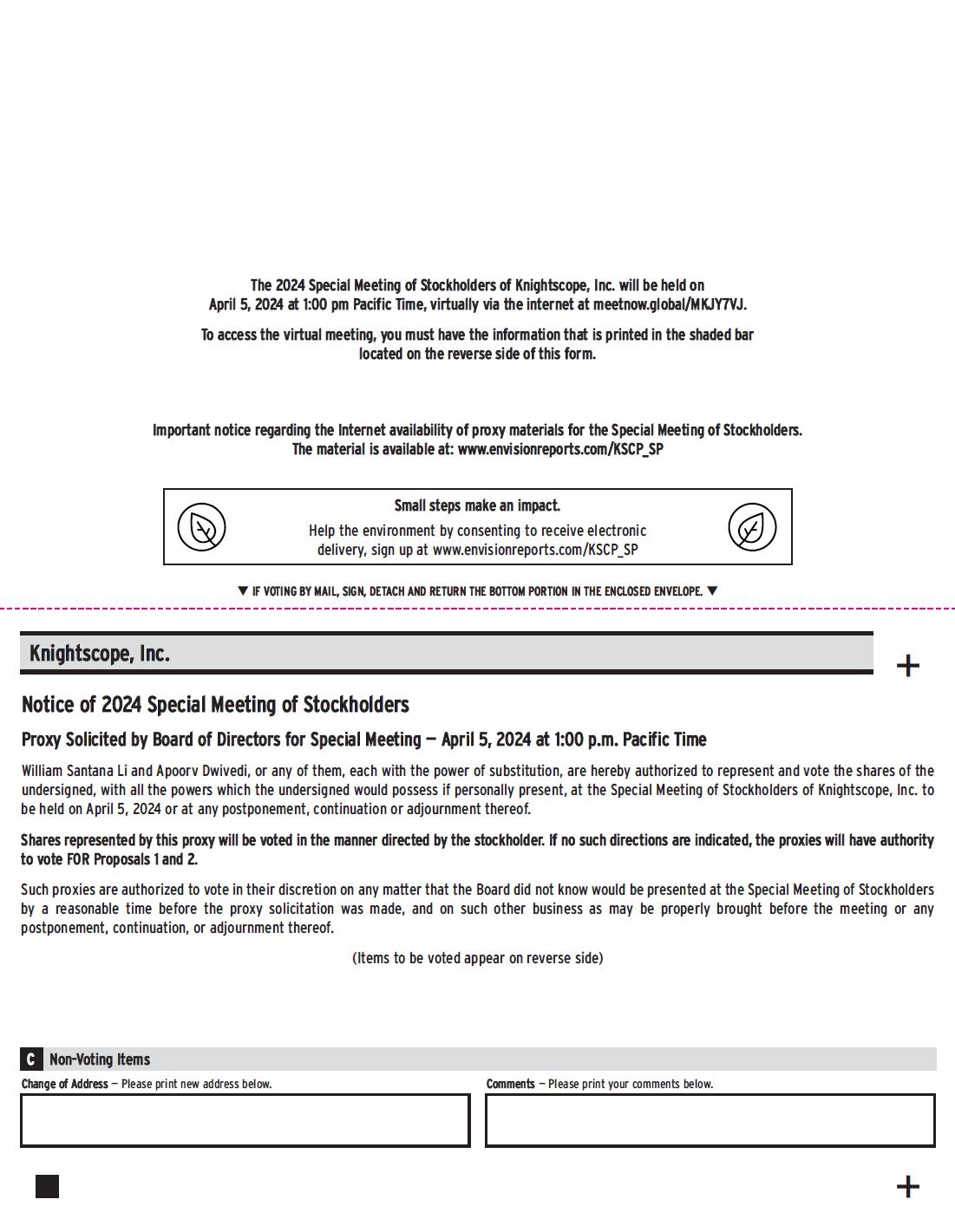 The 2024 Special Meeting of Stockholders of Knightscope, Inc. will be held on April 5, 2024 at 1:00 pm Pacific Time, virtually via the internet at meetnow.global/MKJY7VJ. To access the virtual meeting, you must have the information that is printed in the shaded bar located on the reverse side of this form. Important notice regarding the Internet availability of proxy materials for the Special Meeting of Stockholders. The material is available at: www.envisionreports.com/KSCP_SP Small steps make an impact. Help the environment by consenting to receive electronic delivery, sign up at www.envisionreports.com/KSCP_SP IF VOTING BY MAIL, SIGN, DETACH AND RETURN THE BOTTOM PORTION IN THE ENCLOSED ENVELOPE Knightscope, Inc. Notice of 2024 Special Meeting of Stockholders Proxy Solicited by Board of Directors for Special Meeting - April 5, 2024 at 1:00 p.m. Pacific Time William Santana Li and Apoorv Dwivedi, or any of them, each with the power of substitution, are hereby authorized to represent and vote the shares of the undersigned, with all the powers which the undersigned would possess if personally present, at the Special Meeting of Stockholders of Knightscope, Inc. to be held on April 5, 2024 or at any postponement, continuation or adjournment thereof. Shares represented by this proxy will be voted in the manner directed by the stockholder. If no such directions are indicated, the proxies will have authority to vote FOR Proposals 1 and 2. Such proxies are authorized to vote in their discretion on any matter that the Board did not know would be presented at the Special Meeting of Stockholders by a reasonable time before the proxy solicitation was made, and on such other business as may be properly brought before the meeting or any postponement, continuation, or adjournment thereof. (Items to be voted appear on reverse side) . Change of Address - Please print new address below. Comments - Please print your comments below. C Non-Voting Items