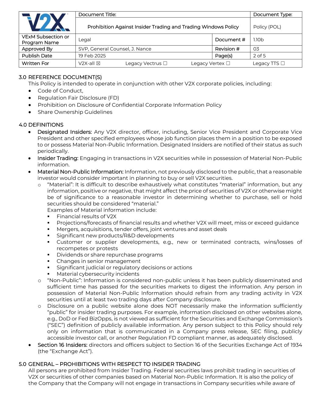 Document Title: Document Type: Prohibition Against Insider Trading and Trading Windows Policy Policy (POL) VExM Subsection or Program Name Legal Document # 1.10b Approved By SVP, General Counsel, J. Nance Revision # 03 Publish Date 19 Feb 2025 Page(s) 2 of 5 Written For V2X-all ☒ Legacy Vectrus ☐ Legacy Vertex ☐ Legacy TTS ☐ 3.0 REFERENCE DOCUMENT(S) This Policy is intended to operate in conjunction with other V2X corporate policies, including: • Code of Conduct, • Regulation Fair Disclosure (FD) • Prohibition on Disclosure of Confidential Corporate Information Policy • Share Ownership Guidelines 4.0 DEFINITIONS • Designated Insiders: Any V2X director, officer, including, Senior Vice President and Corporate Vice President and other specified employees whose job function places them in a position to be exposed to or possess Material Non-Public Information. Designated Insiders are notified of their status as such periodically. • Insider Trading: Engaging in transactions in V2X securities while in possession of Material Non-Public information. • Material Non-Public Information: Information, not previously disclosed to the public, that a reasonable investor would consider important in planning to buy or sell V2X securities. o “Material”: It is difficult to describe exhaustively what constitutes “material” information, but any information, positive or negative, that might affect the price of securities of V2X or otherwise might be of significance to a reasonable investor in determining whether to purchase, sell or hold securities should be considered “material.” Examples of Material information include: ▪ Financial results of V2X ▪ Projections/forecasts of financial results and whether V2X will meet, miss or exceed guidance ▪ Mergers, acquisitions, tender offers, joint ventures and asset deals ▪ Significant new products/R&D developments ▪ Customer or supplier developments, e.g., new or terminated contracts, wins/losses of recompetes or protests ▪ Dividends or share repurchase programs ▪ Changes in senior management ▪ Significant judicial or regulatory decisions or actions ▪ Material cybersecurity incidents o “Non-Public”: Information is considered non-public unless it has been publicly disseminated and sufficient time has passed for the securities markets to digest the information. Any person in possession of Material Non-Public Information should refrain from any trading activity in V2X securities until at least two trading days after Company disclosure. o Disclosure on a public website alone does NOT necessarily make the information sufficiently “public” for insider trading purposes. For example, information disclosed on other websites alone, e.g., DoD or Fed BizOpps, is not viewed as sufficient for the Securities and Exchange Commission’s (“SEC”) definition of publicly available information. Any person subject to this Policy should rely only on information that is communicated in a Company press release, SEC filing, publicly accessible investor call, or another Regulation FD compliant manner, as adequately disclosed. • Section 16 Insiders: directors and officers subject to Section 16 of the Securities Exchange Act of 1934 (the “Exchange Act”). 5.0 GENERAL – PROHIBITIONS WITH RESPECT TO INSIDER TRADING All persons are prohibited from Insider Trading. Federal securities laws prohibit trading in securities of V2X or securities of other companies based on Material Non-Public Information. It is also the policy of the Company that the Company will not engage in transactions in Company securities while aware of