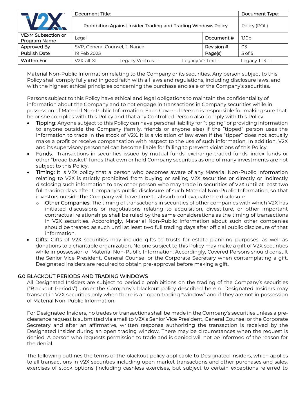 Document Title: Document Type: Prohibition Against Insider Trading and Trading Windows Policy Policy (POL) VExM Subsection or Program Name Legal Document # 1.10b Approved By SVP, General Counsel, J. Nance Revision # 03 Publish Date 19 Feb 2025 Page(s) 3 of 5 Written For V2X-all ☒ Legacy Vectrus ☐ Legacy Vertex ☐ Legacy TTS ☐ Material Non-Public Information relating to the Company or its securities. Any person subject to this Policy shall comply fully and in good faith with all laws and regulations, including disclosure laws, and with the highest ethical principles concerning the purchase and sale of the Company’s securities. Persons subject to this Policy have ethical and legal obligations to maintain the confidentiality of information about the Company and to not engage in transactions in Company securities while in possession of Material Non-Public Information. Each Covered Person is responsible for making sure that he or she complies with this Policy and that any Controlled Person also comply with this Policy. • Tipping: Anyone subject to this Policy can have personal liability for “tipping” or providing information to anyone outside the Company (family, friends or anyone else) if the “tipped” person uses the information to trade in the stock of V2X. It is a violation of law even if the “tipper” does not actually make a profit or receive compensation with respect to the use of such information. In addition, V2X and its supervisory personnel can become liable for failing to prevent violations of this Policy. • Funds: Transactions in securities issued by mutual funds, exchange-traded funds, index funds or other “broad basket” funds that own or hold Company securities as one of many investments are not subject to this Policy. • Timing: It is V2X policy that a person who becomes aware of any Material Non-Public Information relating to V2X is strictly prohibited from buying or selling V2X securities or directly or indirectly disclosing such information to any other person who may trade in securities of V2X until at least two full trading days after Company’s public disclosure of such Material Non-Public Information, so that investors outside the Company will have time to absorb and evaluate the disclosure. o Other Companies: The timing of transactions in securities of other companies with which V2X has initiated discussions or negotiations relating to acquisition, divestiture, or other important contractual relationships shall be ruled by the same considerations as the timing of transactions in V2X securities. Accordingly, Material Non-Public Information about such other companies should be treated as such until at least two full trading days after official public disclosure of that information. • Gifts: Gifts of V2X securities may include gifts to trusts for estate planning purposes, as well as donations to a charitable organization. No one subject to this Policy may make a gift of V2X securities while in possession of Material Non-Public Information. Accordingly, Covered Persons should consult the Senior Vice President, General Counsel or the Corporate Secretary when contemplating a gift. Designated Insiders are required to obtain pre-approval before making a gift. 6.0 BLACKOUT PERIODS AND TRADING WINDOWS All Designated Insiders are subject to periodic prohibitions on the trading of the Company’s securities (“Blackout Periods”) under the Company’s blackout policy described herein. Designated Insiders may transact in V2X securities only when there is an open trading “window” and if they are not in possession of Material Non-Public Information. For Designated Insiders, no trades or transactions shall be made in the Company’s securities unless a pre- clearance request is submitted via email to V2X’s Senior Vice President, General Counsel or the Corporate Secretary and after an affirmative, written response authorizing the transaction is received by the Designated Insider during an open trading window. There may be circumstances when the request is denied. A person who requests permission to trade and is denied will not be informed of the reason for the denial. The following outlines the terms of the blackout policy applicable to Designated Insiders, which applies to all transactions in V2X securities including open market transactions and other purchases and sales, exercises of stock options (including cashless exercises, but subject to certain exceptions referred to
