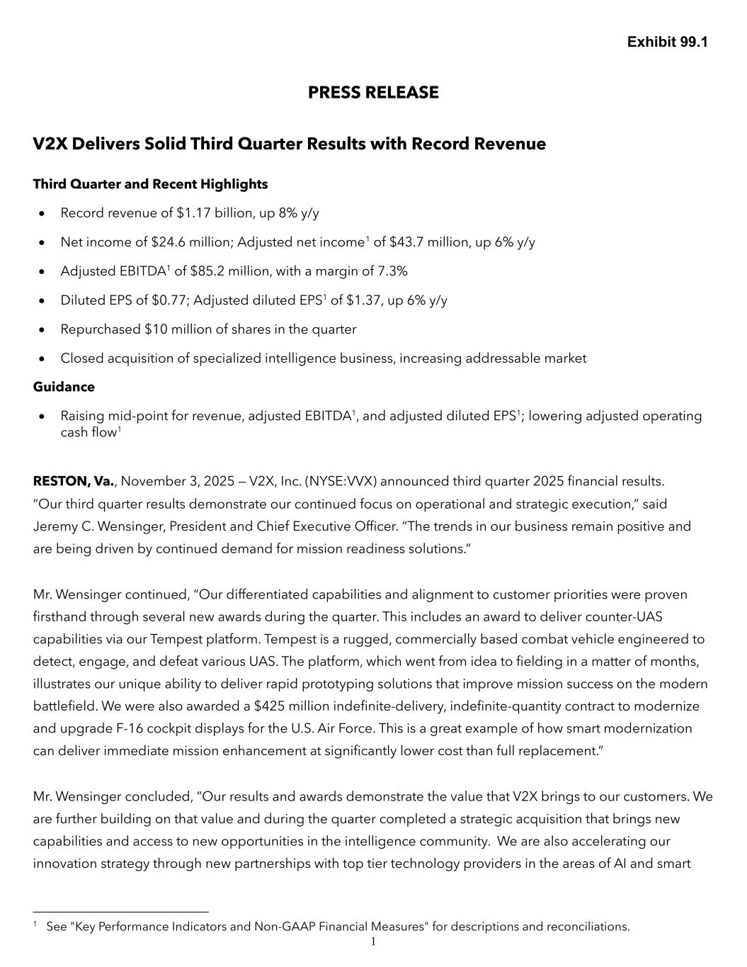 1 PRESS RELEASE V2X Delivers Solid Third Quarter Results with Record Revenue Third Quarter and Recent Highlights • Record revenue of $1.17 billion, up 8% y/y • Net income of $24.6 million; Adjusted net income1 of $43.7 million, up 6% y/y • Adjusted EBITDA1 of $85.2 million, with a margin of 7.3% • Diluted EPS of $0.77; Adjusted diluted EPS1 of $1.37, up 6% y/y • Repurchased $10 million of shares in the quarter • Closed acquisition of specialized intelligence business, increasing addressable market Guidance • Raising mid-point for revenue, adjusted EBITDA1, and adjusted diluted EPS1; lowering adjusted operating cash flow1 RESTON, Va., November 3, 2025 — V2X, Inc. (NYSE:VVX) announced third quarter 2025 financial results. “Our third quarter results demonstrate our continued focus on operational and strategic execution,” said Jeremy C. Wensinger, President and Chief Executive Officer. “The trends in our business remain positive and are being driven by continued demand for mission readiness solutions.” Mr. Wensinger continued, “Our differentiated capabilities and alignment to customer priorities were proven firsthand through several new awards during the quarter. This includes an award to deliver counter-UAS capabilities via our Tempest platform. Tempest is a rugged, commercially based combat vehicle engineered to detect, engage, and defeat various UAS. The platform, which went from idea to fielding in a matter of months, illustrates our unique ability to deliver rapid prototyping solutions that improve mission success on the modern battlefield. We were also awarded a $425 million indefinite-delivery, indefinite-quantity contract to modernize and upgrade F-16 cockpit displays for the U.S. Air Force. This is a great example of how smart modernization can deliver immediate mission enhancement at significantly lower cost than full replacement.” Mr. Wensinger concluded, “Our results and awards demonstrate the value that V2X brings to our customers. We are further building on that value and during the quarter completed a strategic acquisition that brings new capabilities and access to new opportunities in the intelligence community. We are also accelerating our innovation strategy through new partnerships with top tier technology providers in the areas of AI and smart 1 See "Key Performance Indicators and Non-GAAP Financial Measures" for descriptions and reconciliations.