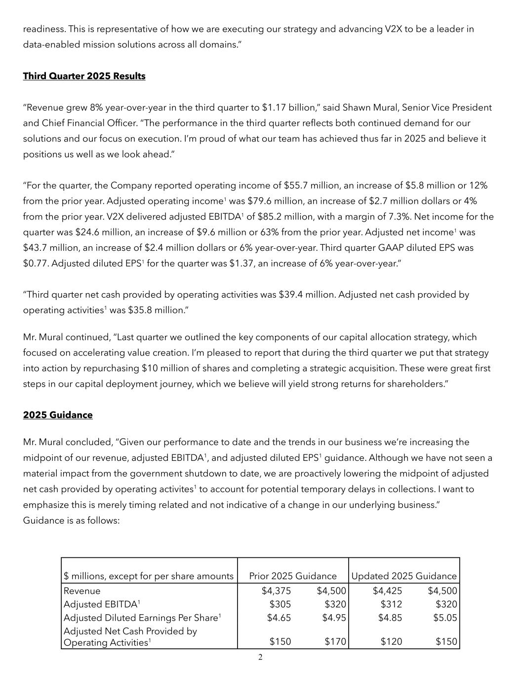 2 readiness. This is representative of how we are executing our strategy and advancing V2X to be a leader in data-enabled mission solutions across all domains.” Third Quarter 2025 Results “Revenue grew 8% year-over-year in the third quarter to $1.17 billion,” said Shawn Mural, Senior Vice President and Chief Financial Officer. “The performance in the third quarter reflects both continued demand for our solutions and our focus on execution. I’m proud of what our team has achieved thus far in 2025 and believe it positions us well as we look ahead.” “For the quarter, the Company reported operating income of $55.7 million, an increase of $5.8 million or 12% from the prior year. Adjusted operating income1 was $79.6 million, an increase of $2.7 million dollars or 4% from the prior year. V2X delivered adjusted EBITDA1 of $85.2 million, with a margin of 7.3%. Net income for the quarter was $24.6 million, an increase of $9.6 million or 63% from the prior year. Adjusted net income1 was $43.7 million, an increase of $2.4 million dollars or 6% year-over-year. Third quarter GAAP diluted EPS was $0.77. Adjusted diluted EPS1 for the quarter was $1.37, an increase of 6% year-over-year.” “Third quarter net cash provided by operating activities was $39.4 million. Adjusted net cash provided by operating activities1 was $35.8 million.” Mr. Mural continued, “Last quarter we outlined the key components of our capital allocation strategy, which focused on accelerating value creation. I’m pleased to report that during the third quarter we put that strategy into action by repurchasing $10 million of shares and completing a strategic acquisition. These were great first steps in our capital deployment journey, which we believe will yield strong returns for shareholders.” 2025 Guidance Mr. Mural concluded, “Given our performance to date and the trends in our business we’re increasing the midpoint of our revenue, adjusted EBITDA1, and adjusted diluted EPS1 guidance. Although we have not seen a material impact from the government shutdown to date, we are proactively lowering the midpoint of adjusted net cash provided by operating activites1 to account for potential temporary delays in collections. I want to emphasize this is merely timing related and not indicative of a change in our underlying business.” Guidance is as follows: $ millions, except for per share amounts Prior 2025 Guidance Updated 2025 Guidance Revenue $4,375 $4,500 $4,425 $4,500 Adjusted EBITDA1 $305 $320 $312 $320 Adjusted Diluted Earnings Per Share1 $4.65 $4.95 $4.85 $5.05 Adjusted Net Cash Provided by Operating Activities1 $150 $170 $120 $150