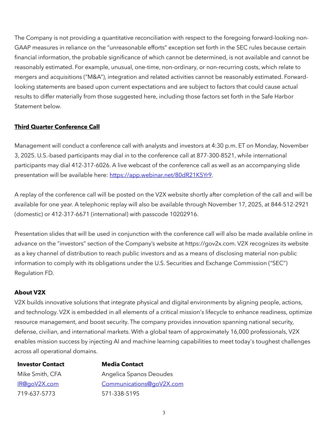 3 The Company is not providing a quantitative reconciliation with respect to the foregoing forward-looking non- GAAP measures in reliance on the “unreasonable efforts” exception set forth in the SEC rules because certain financial information, the probable significance of which cannot be determined, is not available and cannot be reasonably estimated. For example, unusual, one-time, non-ordinary, or non-recurring costs, which relate to mergers and acquisitions (“M&A”), integration and related activities cannot be reasonably estimated. Forward- looking statements are based upon current expectations and are subject to factors that could cause actual results to differ materially from those suggested here, including those factors set forth in the Safe Harbor Statement below. Third Quarter Conference Call Management will conduct a conference call with analysts and investors at 4:30 p.m. ET on Monday, November 3, 2025. U.S.-based participants may dial in to the conference call at 877-300-8521, while international participants may dial 412-317-6026. A live webcast of the conference call as well as an accompanying slide presentation will be available here: https://app.webinar.net/80dR21K5Yr9. A replay of the conference call will be posted on the V2X website shortly after completion of the call and will be available for one year. A telephonic replay will also be available through November 17, 2025, at 844-512-2921 (domestic) or 412-317-6671 (international) with passcode 10202916. Presentation slides that will be used in conjunction with the conference call will also be made available online in advance on the “investors” section of the Company’s website at https://gov2x.com. V2X recognizes its website as a key channel of distribution to reach public investors and as a means of disclosing material non-public information to comply with its obligations under the U.S. Securities and Exchange Commission (“SEC”) Regulation FD. About V2X V2X builds innovative solutions that integrate physical and digital environments by aligning people, actions, and technology. V2X is embedded in all elements of a critical mission's lifecycle to enhance readiness, optimize resource management, and boost security. The company provides innovation spanning national security, defense, civilian, and international markets. With a global team of approximately 16,000 professionals, V2X enables mission success by injecting AI and machine learning capabilities to meet today's toughest challenges across all operational domains. Investor Contact Media Contact Mike Smith, CFA Angelica Spanos Deoudes IR@goV2X.com Communications@goV2X.com 719-637-5773 571-338-5195