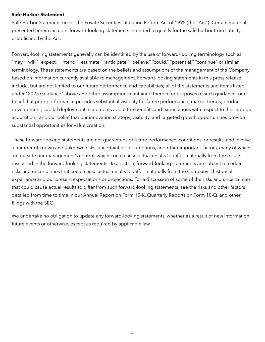 4 Safe Harbor Statement Safe Harbor Statement under the Private Securities Litigation Reform Act of 1995 (the "Act"): Certain material presented herein includes forward-looking statements intended to qualify for the safe harbor from liability established by the Act. Forward-looking statements generally can be identified by the use of forward-looking terminology such as “may,” “will,” “expect,” “intend,” “estimate,” “anticipate,” “believe,” “could,” “potential,” “continue” or similar terminology. These statements are based on the beliefs and assumptions of the management of the Company based on information currently available to management. Forward-looking statements in this press release, include, but are not limited to our future performance and capabilities; all of the statements and items listed under "2025 Guidance" above and other assumptions contained therein for purposes of such guidance; our belief that prior performance provides substantial visibility for future performance; market trends; product development; capital deployment; statements about the benefits and expectations with respect to the strategic acquisition; and our belief that our innovation strategy, visibility, and targeted growth opportunities provide substantial opportunities for value creation. These forward-looking statements are not guarantees of future performance, conditions, or results, and involve a number of known and unknown risks, uncertainties, assumptions, and other important factors, many of which are outside our management’s control, which could cause actual results to differ materially from the results discussed in the forward-looking statements. In addition, forward-looking statements are subject to certain risks and uncertainties that could cause actual results to differ materially from the Company's historical experience and our present expectations or projections. For a discussion of some of the risks and uncertainties that could cause actual results to differ from such forward-looking statements, see the risks and other factors detailed from time to time in our Annual Report on Form 10-K, Quarterly Reports on Form 10-Q, and other filings with the SEC. We undertake no obligation to update any forward-looking statements, whether as a result of new information, future events or otherwise, except as required by applicable law.