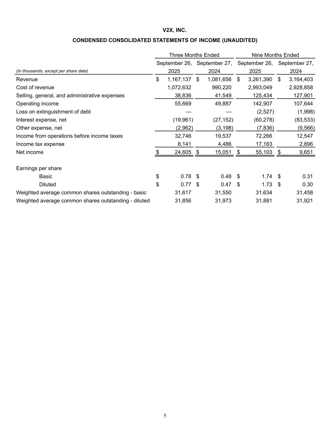 5 V2X, INC. CONDENSED CONSOLIDATED STATEMENTS OF INCOME (UNAUDITED) Three Months Ended Nine Months Ended September 26, September 27, September 26, September 27, (In thousands, except per share data) 2025 2024 2025 2024 Revenue $ 1,167,137 $ 1,081,656 $ 3,261,390 $ 3,164,403 Cost of revenue 1,072,632 990,220 2,993,049 2,928,858 Selling, general, and administrative expenses 38,836 41,549 125,434 127,901 Operating income 55,669 49,887 142,907 107,644 Loss on extinguishment of debt — — (2,527) (1,998) Interest expense, net (19,961) (27,152) (60,278) (83,533) Other expense, net (2,962) (3,198) (7,836) (9,566) Income from operations before income taxes 32,746 19,537 72,266 12,547 Income tax expense 8,141 4,486 17,163 2,896 Net income $ 24,605 $ 15,051 $ 55,103 $ 9,651 Earnings per share Basic $ 0.78 $ 0.48 $ 1.74 $ 0.31 Diluted $ 0.77 $ 0.47 $ 1.73 $ 0.30 Weighted average common shares outstanding - basic 31,617 31,550 31,634 31,458 Weighted average common shares outstanding - diluted 31,856 31,973 31,881 31,921