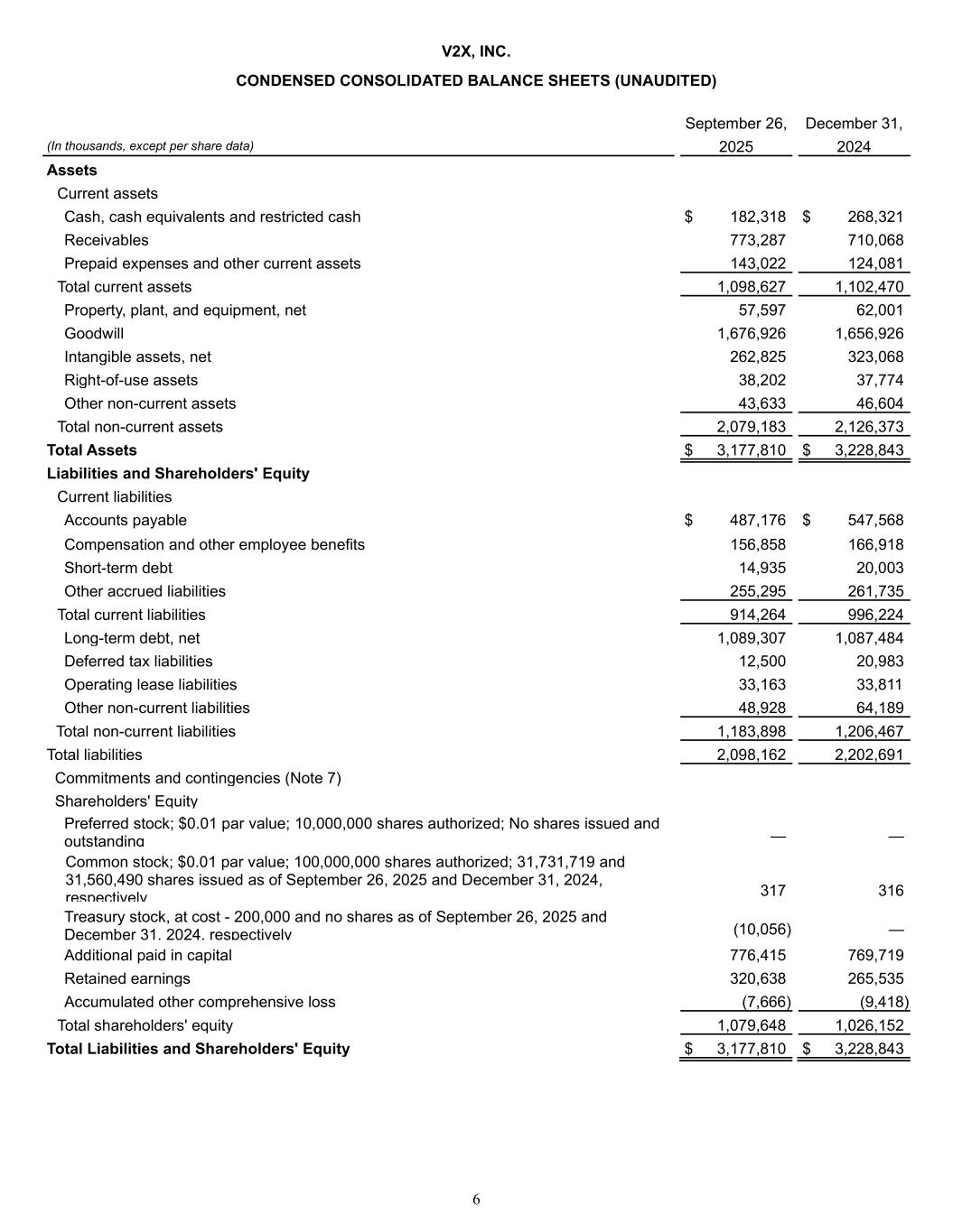 6 V2X, INC. CONDENSED CONSOLIDATED BALANCE SHEETS (UNAUDITED) September 26, December 31, (In thousands, except per share data) 2025 2024 Assets Current assets Cash, cash equivalents and restricted cash $ 182,318 $ 268,321 Receivables 773,287 710,068 Prepaid expenses and other current assets 143,022 124,081 Total current assets 1,098,627 1,102,470 Property, plant, and equipment, net 57,597 62,001 Goodwill 1,676,926 1,656,926 Intangible assets, net 262,825 323,068 Right-of-use assets 38,202 37,774 Other non-current assets 43,633 46,604 Total non-current assets 2,079,183 2,126,373 Total Assets $ 3,177,810 $ 3,228,843 Liabilities and Shareholders' Equity Current liabilities Accounts payable $ 487,176 $ 547,568 Compensation and other employee benefits 156,858 166,918 Short-term debt 14,935 20,003 Other accrued liabilities 255,295 261,735 Total current liabilities 914,264 996,224 Long-term debt, net 1,089,307 1,087,484 Deferred tax liabilities 12,500 20,983 Operating lease liabilities 33,163 33,811 Other non-current liabilities 48,928 64,189 Total non-current liabilities 1,183,898 1,206,467 Total liabilities 2,098,162 2,202,691 Commitments and contingencies (Note 7) Shareholders' Equity Preferred stock; $0.01 par value; 10,000,000 shares authorized; No shares issued and outstanding — — Common stock; $0.01 par value; 100,000,000 shares authorized; 31,731,719 and 31,560,490 shares issued as of September 26, 2025 and December 31, 2024, respectively 317 316 Treasury stock, at cost - 200,000 and no shares as of September 26, 2025 and December 31, 2024, respectively (10,056) — Additional paid in capital 776,415 769,719 Retained earnings 320,638 265,535 Accumulated other comprehensive loss (7,666) (9,418) Total shareholders' equity 1,079,648 1,026,152 Total Liabilities and Shareholders' Equity $ 3,177,810 $ 3,228,843