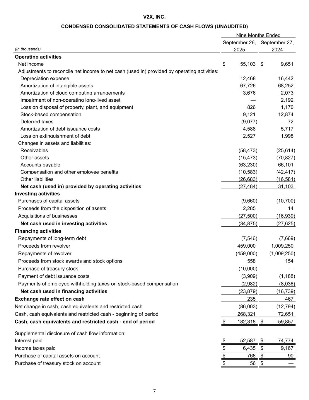 7 V2X, INC. CONDENSED CONSOLIDATED STATEMENTS OF CASH FLOWS (UNAUDITED) Nine Months Ended September 26, September 27, (In thousands) 2025 2024 Operating activities Net income $ 55,103 $ 9,651 Adjustments to reconcile net income to net cash (used in) provided by operating activities: Depreciation expense 12,468 16,442 Amortization of intangible assets 67,726 68,252 Amortization of cloud computing arrangements 3,676 2,073 Impairment of non-operating long-lived asset — 2,192 Loss on disposal of property, plant, and equipment 826 1,170 Stock-based compensation 9,121 12,874 Deferred taxes (9,077) 72 Amortization of debt issuance costs 4,588 5,717 Loss on extinguishment of debt 2,527 1,998 Changes in assets and liabilities: Receivables (58,473) (25,614) Other assets (15,473) (70,827) Accounts payable (63,230) 66,101 Compensation and other employee benefits (10,583) (42,417) Other liabilities (26,683) (16,581) Net cash (used in) provided by operating activities (27,484) 31,103 Investing activities Purchases of capital assets (9,660) (10,700) Proceeds from the disposition of assets 2,285 14 Acquisitions of businesses (27,500) (16,939) Net cash used in investing activities (34,875) (27,625) Financing activities Repayments of long-term debt (7,546) (7,669) Proceeds from revolver 459,000 1,009,250 Repayments of revolver (459,000) (1,009,250) Proceeds from stock awards and stock options 558 154 Purchase of treasury stock (10,000) — Payment of debt issuance costs (3,909) (1,188) Payments of employee withholding taxes on stock-based compensation (2,982) (8,036) Net cash used in financing activities (23,879) (16,739) Exchange rate effect on cash 235 467 Net change in cash, cash equivalents and restricted cash (86,003) (12,794) Cash, cash equivalents and restricted cash - beginning of period 268,321 72,651 Cash, cash equivalents and restricted cash - end of period $ 182,318 $ 59,857 Supplemental disclosure of cash flow information: Interest paid $ 52,587 $ 74,774 Income taxes paid $ 6,435 $ 9,167 Purchase of capital assets on account $ 768 $ 90 Purchase of treasury stock on account $ 56 $ —