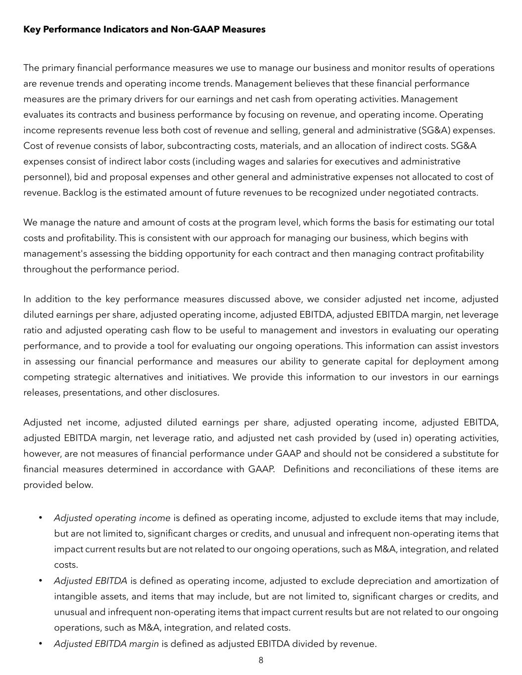 8 Key Performance Indicators and Non-GAAP Measures The primary financial performance measures we use to manage our business and monitor results of operations are revenue trends and operating income trends. Management believes that these financial performance measures are the primary drivers for our earnings and net cash from operating activities. Management evaluates its contracts and business performance by focusing on revenue, and operating income. Operating income represents revenue less both cost of revenue and selling, general and administrative (SG&A) expenses. Cost of revenue consists of labor, subcontracting costs, materials, and an allocation of indirect costs. SG&A expenses consist of indirect labor costs (including wages and salaries for executives and administrative personnel), bid and proposal expenses and other general and administrative expenses not allocated to cost of revenue. Backlog is the estimated amount of future revenues to be recognized under negotiated contracts. We manage the nature and amount of costs at the program level, which forms the basis for estimating our total costs and profitability. This is consistent with our approach for managing our business, which begins with management's assessing the bidding opportunity for each contract and then managing contract profitability throughout the performance period. In addition to the key performance measures discussed above, we consider adjusted net income, adjusted diluted earnings per share, adjusted operating income, adjusted EBITDA, adjusted EBITDA margin, net leverage ratio and adjusted operating cash flow to be useful to management and investors in evaluating our operating performance, and to provide a tool for evaluating our ongoing operations. This information can assist investors in assessing our financial performance and measures our ability to generate capital for deployment among competing strategic alternatives and initiatives. We provide this information to our investors in our earnings releases, presentations, and other disclosures. Adjusted net income, adjusted diluted earnings per share, adjusted operating income, adjusted EBITDA, adjusted EBITDA margin, net leverage ratio, and adjusted net cash provided by (used in) operating activities, however, are not measures of financial performance under GAAP and should not be considered a substitute for financial measures determined in accordance with GAAP. Definitions and reconciliations of these items are provided below. • Adjusted operating income is defined as operating income, adjusted to exclude items that may include, but are not limited to, significant charges or credits, and unusual and infrequent non-operating items that impact current results but are not related to our ongoing operations, such as M&A, integration, and related costs. • Adjusted EBITDA is defined as operating income, adjusted to exclude depreciation and amortization of intangible assets, and items that may include, but are not limited to, significant charges or credits, and unusual and infrequent non-operating items that impact current results but are not related to our ongoing operations, such as M&A, integration, and related costs. • Adjusted EBITDA margin is defined as adjusted EBITDA divided by revenue.
