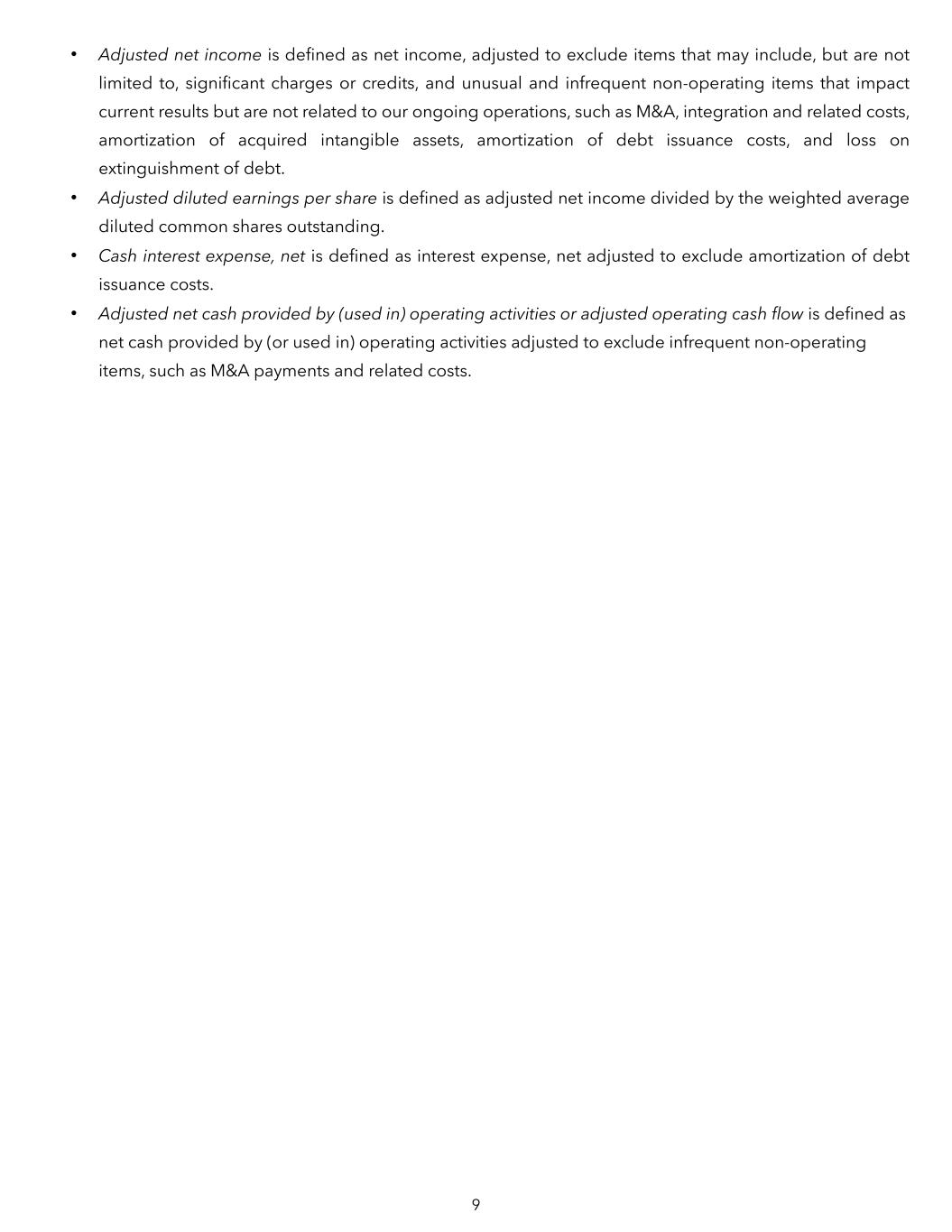 9 • Adjusted net income is defined as net income, adjusted to exclude items that may include, but are not limited to, significant charges or credits, and unusual and infrequent non-operating items that impact current results but are not related to our ongoing operations, such as M&A, integration and related costs, amortization of acquired intangible assets, amortization of debt issuance costs, and loss on extinguishment of debt. • Adjusted diluted earnings per share is defined as adjusted net income divided by the weighted average diluted common shares outstanding. • Cash interest expense, net is defined as interest expense, net adjusted to exclude amortization of debt issuance costs. • Adjusted net cash provided by (used in) operating activities or adjusted operating cash flow is defined as net cash provided by (or used in) operating activities adjusted to exclude infrequent non-operating items, such as M&A payments and related costs.