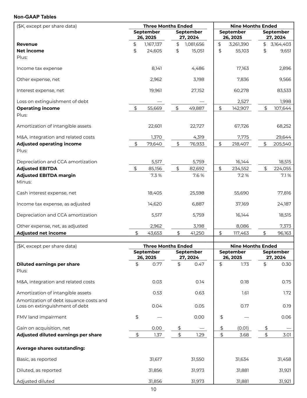 10 Non-GAAP Tables ($K, except per share data) Three Months Ended Nine Months Ended September 26, 2025 September 27, 2024 September 26, 2025 September 27, 2024 Revenue $ 1,167,137 $ 1,081,656 $ 3,261,390 $ 3,164,403 Net income $ 24,605 $ 15,051 $ 55,103 $ 9,651 Plus: Income tax expense 8,141 4,486 17,163 2,896 Other expense, net 2,962 3,198 7,836 9,566 Interest expense, net 19,961 27,152 60,278 83,533 Loss on extinguishment of debt — — 2,527 1,998 Operating income $ 55,669 $ 49,887 $ 142,907 $ 107,644 Plus: Amortization of intangible assets 22,601 22,727 67,726 68,252 M&A, integration and related costs 1,370 4,319 7,775 29,644 Adjusted operating income $ 79,640 $ 76,933 $ 218,407 $ 205,540 Plus: Depreciation and CCA amortization 5,517 5,759 16,144 18,515 Adjusted EBITDA $ 85,156 $ 82,692 $ 234,552 $ 224,055 Adjusted EBITDA margin 7.3 % 7.6 % 7.2 % 7.1 % Minus: Cash interest expense, net 18,405 25,598 55,690 77,816 Income tax expense, as adjusted 14,620 6,887 37,169 24,187 Depreciation and CCA amortization 5,517 5,759 16,144 18,515 Other expense, net, as adjusted 2,962 3,198 8,086 7,373 Adjusted net income $ 43,653 $ 41,250 $ 117,463 $ 96,163 ($K, except per share data) Three Months Ended Nine Months Ended September 26, 2025 September 27, 2024 September 26, 2025 September 27, 2024 Diluted earnings per share $ 0.77 $ 0.47 $ 1.73 $ 0.30 Plus: M&A, integration and related costs 0.03 0.14 0.18 0.75 Amortization of intangible assets 0.53 0.63 1.61 1.72 Amortization of debt issuance costs and Loss on extinguishment of debt 0.04 0.05 0.17 0.19 FMV land impairment $ — 0.00 $ — 0.06 Gain on acquisition, net 0.00 $ — $ (0.01) $ — Adjusted diluted earnings per share $ 1.37 $ 1.29 $ 3.68 $ 3.01 Average shares outstanding: Basic, as reported 31,617 31,550 31,634 31,458 Diluted, as reported 31,856 31,973 31,881 31,921 Adjusted diluted 31,856 31,973 31,881 31,921
