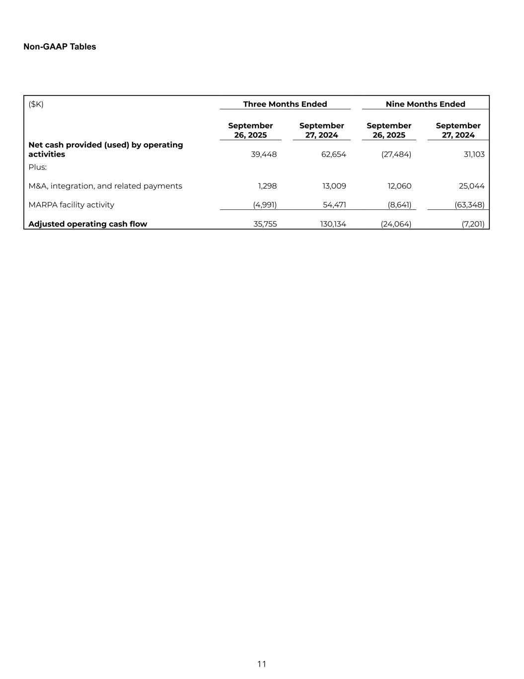 11 Non-GAAP Tables ($K) Three Months Ended Nine Months Ended September 26, 2025 September 27, 2024 September 26, 2025 September 27, 2024 Net cash provided (used) by operating activities 39,448 62,654 (27,484) 31,103 Plus: M&A, integration, and related payments 1,298 13,009 12,060 25,044 MARPA facility activity (4,991) 54,471 (8,641) (63,348) Adjusted operating cash flow 35,755 130,134 (24,064) (7,201)