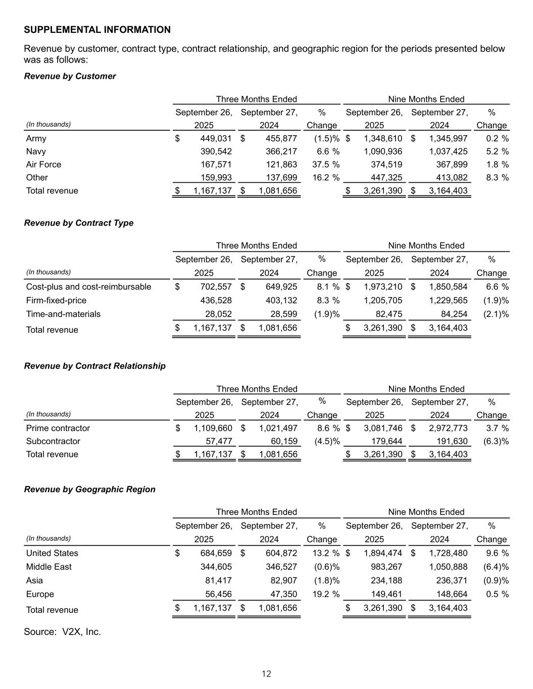 12 SUPPLEMENTAL INFORMATION Revenue by customer, contract type, contract relationship, and geographic region for the periods presented below was as follows: Revenue by Customer Three Months Ended Nine Months Ended September 26, September 27, % September 26, September 27, % (In thousands) 2025 2024 Change 2025 2024 Change Army $ 449,031 $ 455,877 (1.5) % $ 1,348,610 $ 1,345,997 0.2 % Navy 390,542 366,217 6.6 % 1,090,936 1,037,425 5.2 % Air Force 167,571 121,863 37.5 % 374,519 367,899 1.8 % Other 159,993 137,699 16.2 % 447,325 413,082 8.3 % Total revenue $ 1,167,137 $ 1,081,656 $ 3,261,390 $ 3,164,403 Revenue by Contract Type Three Months Ended Nine Months Ended September 26, September 27, % September 26, September 27, % (In thousands) 2025 2024 Change 2025 2024 Change Cost-plus and cost-reimbursable $ 702,557 $ 649,925 8.1 % $ 1,973,210 $ 1,850,584 6.6 % Firm-fixed-price 436,528 403,132 8.3 % 1,205,705 1,229,565 (1.9) % Time-and-materials 28,052 28,599 (1.9) % 82,475 84,254 (2.1) % Total revenue $ 1,167,137 $ 1,081,656 $ 3,261,390 $ 3,164,403 Revenue by Contract Relationship Three Months Ended Nine Months Ended September 26, September 27, % September 26, September 27, % (In thousands) 2025 2024 Change 2025 2024 Change Prime contractor $ 1,109,660 $ 1,021,497 8.6 % $ 3,081,746 $ 2,972,773 3.7 % Subcontractor 57,477 60,159 (4.5) % 179,644 191,630 (6.3) % Total revenue $ 1,167,137 $ 1,081,656 $ 3,261,390 $ 3,164,403 Revenue by Geographic Region Three Months Ended Nine Months Ended September 26, September 27, % September 26, September 27, % (In thousands) 2025 2024 Change 2025 2024 Change United States $ 684,659 $ 604,872 13.2 % $ 1,894,474 $ 1,728,480 9.6 % Middle East 344,605 346,527 (0.6) % 983,267 1,050,888 (6.4) % Asia 81,417 82,907 (1.8) % 234,188 236,371 (0.9) % Europe 56,456 47,350 19.2 % 149,461 148,664 0.5 % Total revenue $ 1,167,137 $ 1,081,656 $ 3,261,390 $ 3,164,403 Source: V2X, Inc.