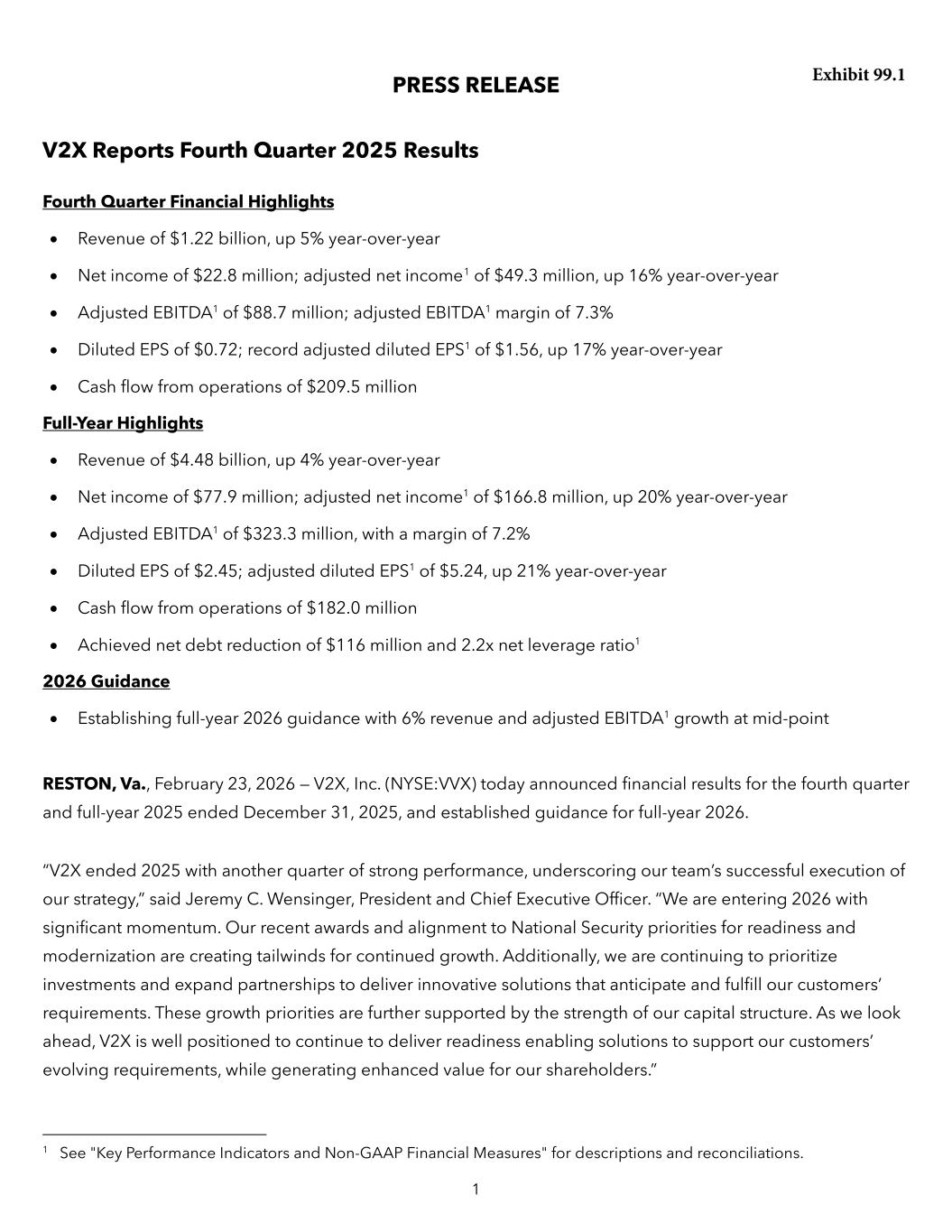 1 PRESS RELEASE V2X Reports Fourth Quarter 2025 Results Fourth Quarter Financial Highlights • Revenue of $1.22 billion, up 5% year-over-year • Net income of $22.8 million; adjusted net income1 of $49.3 million, up 16% year-over-year • Adjusted EBITDA1 of $88.7 million; adjusted EBITDA1 margin of 7.3% • Diluted EPS of $0.72; record adjusted diluted EPS1 of $1.56, up 17% year-over-year • Cash flow from operations of $209.5 million Full-Year Highlights • Revenue of $4.48 billion, up 4% year-over-year • Net income of $77.9 million; adjusted net income1 of $166.8 million, up 20% year-over-year • Adjusted EBITDA1 of $323.3 million, with a margin of 7.2% • Diluted EPS of $2.45; adjusted diluted EPS1 of $5.24, up 21% year-over-year • Cash flow from operations of $182.0 million • Achieved net debt reduction of $116 million and 2.2x net leverage ratio1 2026 Guidance • Establishing full-year 2026 guidance with 6% revenue and adjusted EBITDA1 growth at mid-point RESTON, Va., February 23, 2026 — V2X, Inc. (NYSE:VVX) today announced financial results for the fourth quarter and full-year 2025 ended December 31, 2025, and established guidance for full-year 2026. “V2X ended 2025 with another quarter of strong performance, underscoring our team’s successful execution of our strategy,” said Jeremy C. Wensinger, President and Chief Executive Officer. “We are entering 2026 with significant momentum. Our recent awards and alignment to National Security priorities for readiness and modernization are creating tailwinds for continued growth. Additionally, we are continuing to prioritize investments and expand partnerships to deliver innovative solutions that anticipate and fulfill our customers’ requirements. These growth priorities are further supported by the strength of our capital structure. As we look ahead, V2X is well positioned to continue to deliver readiness enabling solutions to support our customers’ evolving requirements, while generating enhanced value for our shareholders.” 1 See "Key Performance Indicators and Non-GAAP Financial Measures" for descriptions and reconciliations.