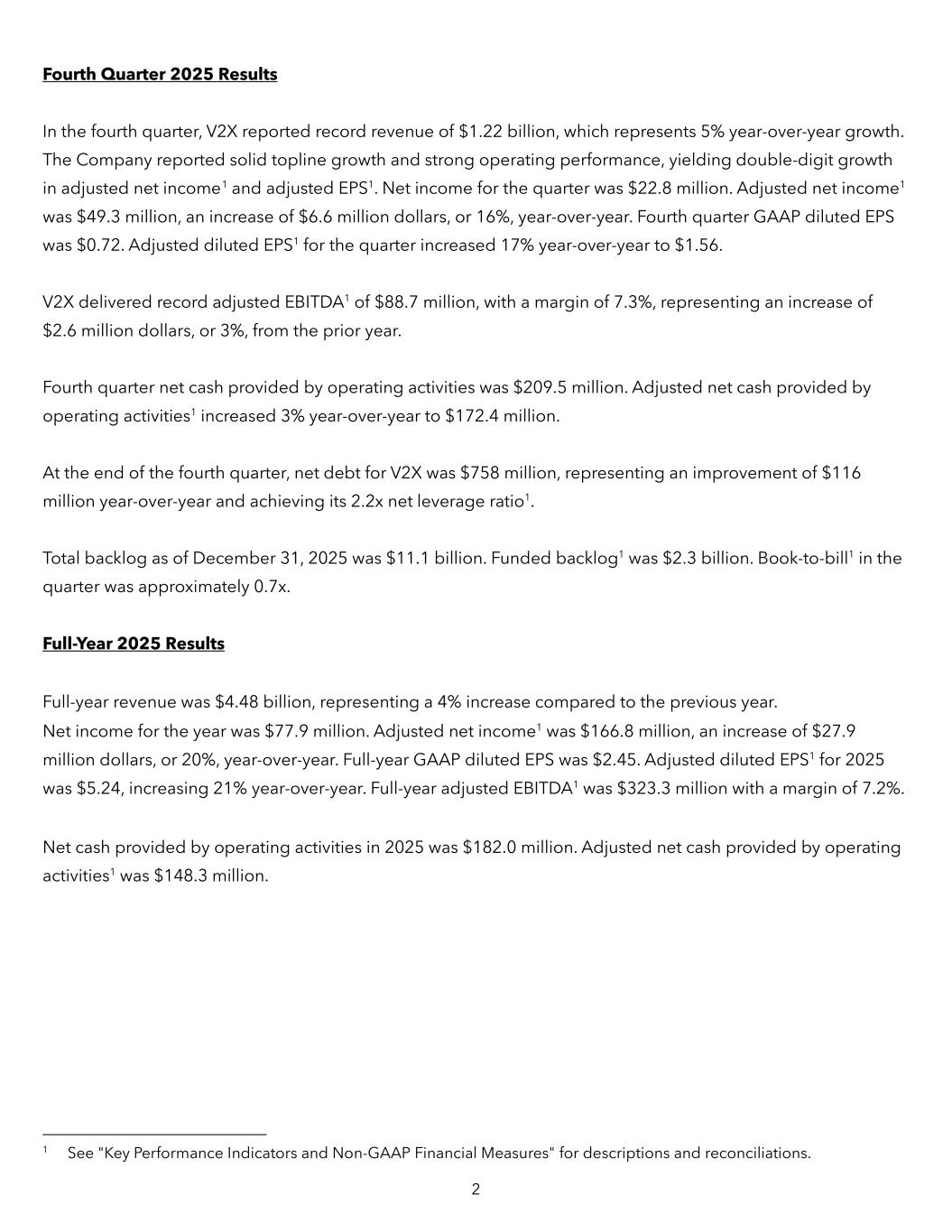 2 Fourth Quarter 2025 Results In the fourth quarter, V2X reported record revenue of $1.22 billion, which represents 5% year-over-year growth. The Company reported solid topline growth and strong operating performance, yielding double-digit growth in adjusted net income1 and adjusted EPS1. Net income for the quarter was $22.8 million. Adjusted net income1 was $49.3 million, an increase of $6.6 million dollars, or 16%, year-over-year. Fourth quarter GAAP diluted EPS was $0.72. Adjusted diluted EPS1 for the quarter increased 17% year-over-year to $1.56. V2X delivered record adjusted EBITDA1 of $88.7 million, with a margin of 7.3%, representing an increase of $2.6 million dollars, or 3%, from the prior year. Fourth quarter net cash provided by operating activities was $209.5 million. Adjusted net cash provided by operating activities1 increased 3% year-over-year to $172.4 million. At the end of the fourth quarter, net debt for V2X was $758 million, representing an improvement of $116 million year-over-year and achieving its 2.2x net leverage ratio1. Total backlog as of December 31, 2025 was $11.1 billion. Funded backlog1 was $2.3 billion. Book-to-bill1 in the quarter was approximately 0.7x. Full-Year 2025 Results Full-year revenue was $4.48 billion, representing a 4% increase compared to the previous year. Net income for the year was $77.9 million. Adjusted net income1 was $166.8 million, an increase of $27.9 million dollars, or 20%, year-over-year. Full-year GAAP diluted EPS was $2.45. Adjusted diluted EPS1 for 2025 was $5.24, increasing 21% year-over-year. Full-year adjusted EBITDA1 was $323.3 million with a margin of 7.2%. Net cash provided by operating activities in 2025 was $182.0 million. Adjusted net cash provided by operating activities1 was $148.3 million. 1 See "Key Performance Indicators and Non-GAAP Financial Measures" for descriptions and reconciliations.
