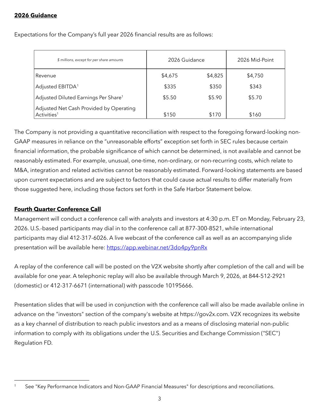 3 2026 Guidance Expectations for the Company’s full year 2026 financial results are as follows: $ millions, except for per share amounts 2026 Guidance 2026 Mid-Point Revenue $4,675 $4,825 $4,750 Adjusted EBITDA1 $335 $350 $343 Adjusted Diluted Earnings Per Share1 $5.50 $5.90 $5.70 Adjusted Net Cash Provided by Operating Activities1 $150 $170 $160 The Company is not providing a quantitative reconciliation with respect to the foregoing forward-looking non- GAAP measures in reliance on the “unreasonable efforts” exception set forth in SEC rules because certain financial information, the probable significance of which cannot be determined, is not available and cannot be reasonably estimated. For example, unusual, one-time, non-ordinary, or non-recurring costs, which relate to M&A, integration and related activities cannot be reasonably estimated. Forward-looking statements are based upon current expectations and are subject to factors that could cause actual results to differ materially from those suggested here, including those factors set forth in the Safe Harbor Statement below. Fourth Quarter Conference Call Management will conduct a conference call with analysts and investors at 4:30 p.m. ET on Monday, February 23, 2026. U.S.-based participants may dial in to the conference call at 877-300-8521, while international participants may dial 412-317-6026. A live webcast of the conference call as well as an accompanying slide presentation will be available here: https://app.webinar.net/3do4py9pnRx A replay of the conference call will be posted on the V2X website shortly after completion of the call and will be available for one year. A telephonic replay will also be available through March 9, 2026, at 844-512-2921 (domestic) or 412-317-6671 (international) with passcode 10195666. Presentation slides that will be used in conjunction with the conference call will also be made available online in advance on the "investors" section of the company's website at https://gov2x.com. V2X recognizes its website as a key channel of distribution to reach public investors and as a means of disclosing material non-public information to comply with its obligations under the U.S. Securities and Exchange Commission ("SEC") Regulation FD. 1 See "Key Performance Indicators and Non-GAAP Financial Measures" for descriptions and reconciliations.