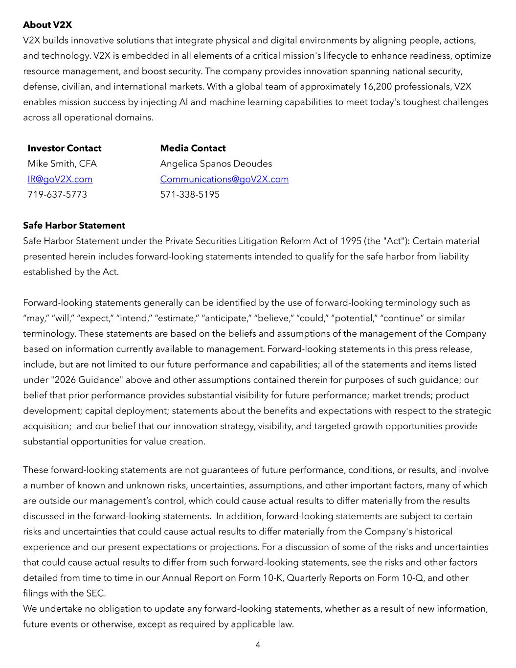 4 About V2X V2X builds innovative solutions that integrate physical and digital environments by aligning people, actions, and technology. V2X is embedded in all elements of a critical mission's lifecycle to enhance readiness, optimize resource management, and boost security. The company provides innovation spanning national security, defense, civilian, and international markets. With a global team of approximately 16,200 professionals, V2X enables mission success by injecting AI and machine learning capabilities to meet today's toughest challenges across all operational domains. Investor Contact Media Contact Mike Smith, CFA Angelica Spanos Deoudes IR@goV2X.com Communications@goV2X.com 719-637-5773 571-338-5195 Safe Harbor Statement Safe Harbor Statement under the Private Securities Litigation Reform Act of 1995 (the "Act"): Certain material presented herein includes forward-looking statements intended to qualify for the safe harbor from liability established by the Act. Forward-looking statements generally can be identified by the use of forward-looking terminology such as “may,” “will,” “expect,” “intend,” “estimate,” “anticipate,” “believe,” “could,” “potential,” “continue” or similar terminology. These statements are based on the beliefs and assumptions of the management of the Company based on information currently available to management. Forward-looking statements in this press release, include, but are not limited to our future performance and capabilities; all of the statements and items listed under "2026 Guidance" above and other assumptions contained therein for purposes of such guidance; our belief that prior performance provides substantial visibility for future performance; market trends; product development; capital deployment; statements about the benefits and expectations with respect to the strategic acquisition; and our belief that our innovation strategy, visibility, and targeted growth opportunities provide substantial opportunities for value creation. These forward-looking statements are not guarantees of future performance, conditions, or results, and involve a number of known and unknown risks, uncertainties, assumptions, and other important factors, many of which are outside our management’s control, which could cause actual results to differ materially from the results discussed in the forward-looking statements. In addition, forward-looking statements are subject to certain risks and uncertainties that could cause actual results to differ materially from the Company's historical experience and our present expectations or projections. For a discussion of some of the risks and uncertainties that could cause actual results to differ from such forward-looking statements, see the risks and other factors detailed from time to time in our Annual Report on Form 10-K, Quarterly Reports on Form 10-Q, and other filings with the SEC. We undertake no obligation to update any forward-looking statements, whether as a result of new information, future events or otherwise, except as required by applicable law.