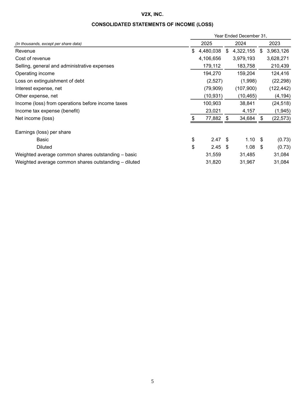 5 V2X, INC. CONSOLIDATED STATEMENTS OF INCOME (LOSS) Year Ended December 31, (In thousands, except per share data) 2025 2024 2023 Revenue $ 4,480,038 $ 4,322,155 $ 3,963,126 Cost of revenue 4,106,656 3,979,193 3,628,271 Selling, general and administrative expenses 179,112 183,758 210,439 Operating income 194,270 159,204 124,416 Loss on extinguishment of debt (2,527) (1,998) (22,298) Interest expense, net (79,909) (107,900) (122,442) Other expense, net (10,931) (10,465) (4,194) Income (loss) from operations before income taxes 100,903 38,841 (24,518) Income tax expense (benefit) 23,021 4,157 (1,945) Net income (loss) $ 77,882 $ 34,684 $ (22,573) Earnings (loss) per share Basic $ 2.47 $ 1.10 $ (0.73) Diluted $ 2.45 $ 1.08 $ (0.73) Weighted average common shares outstanding – basic 31,559 31,485 31,084 Weighted average common shares outstanding – diluted 31,820 31,967 31,084