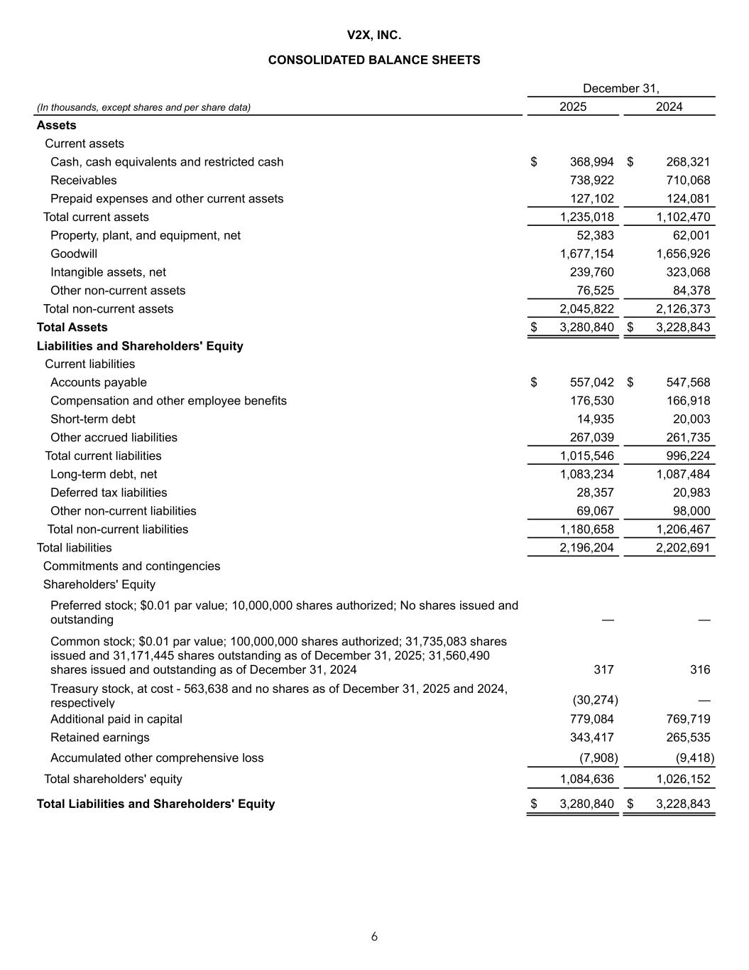 6 V2X, INC. CONSOLIDATED BALANCE SHEETS December 31, (In thousands, except shares and per share data) 2025 2024 Assets Current assets Cash, cash equivalents and restricted cash $ 368,994 $ 268,321 Receivables 738,922 710,068 Prepaid expenses and other current assets 127,102 124,081 Total current assets 1,235,018 1,102,470 Property, plant, and equipment, net 52,383 62,001 Goodwill 1,677,154 1,656,926 Intangible assets, net 239,760 323,068 Other non-current assets 76,525 84,378 Total non-current assets 2,045,822 2,126,373 Total Assets $ 3,280,840 $ 3,228,843 Liabilities and Shareholders' Equity Current liabilities Accounts payable $ 557,042 $ 547,568 Compensation and other employee benefits 176,530 166,918 Short-term debt 14,935 20,003 Other accrued liabilities 267,039 261,735 Total current liabilities 1,015,546 996,224 Long-term debt, net 1,083,234 1,087,484 Deferred tax liabilities 28,357 20,983 Other non-current liabilities 69,067 98,000 Total non-current liabilities 1,180,658 1,206,467 Total liabilities 2,196,204 2,202,691 Commitments and contingencies Shareholders' Equity Preferred stock; $0.01 par value; 10,000,000 shares authorized; No shares issued and outstanding — — Common stock; $0.01 par value; 100,000,000 shares authorized; 31,735,083 shares issued and 31,171,445 shares outstanding as of December 31, 2025; 31,560,490 shares issued and outstanding as of December 31, 2024 317 316 Treasury stock, at cost - 563,638 and no shares as of December 31, 2025 and 2024, respectively (30,274) — Additional paid in capital 779,084 769,719 Retained earnings 343,417 265,535 Accumulated other comprehensive loss (7,908) (9,418) Total shareholders' equity 1,084,636 1,026,152 Total Liabilities and Shareholders' Equity $ 3,280,840 $ 3,228,843