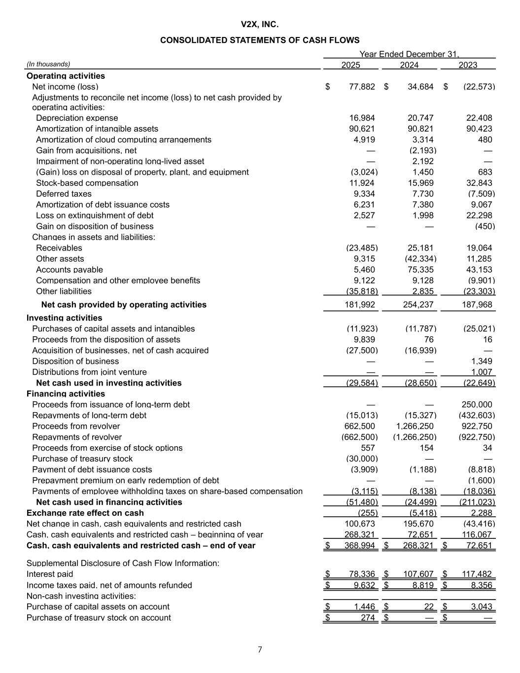 7 V2X, INC. CONSOLIDATED STATEMENTS OF CASH FLOWS Year Ended December 31, (In thousands) 2025 2024 2023 Operating activities Net income (loss) $ 77,882 $ 34,684 $ (22,573) Adjustments to reconcile net income (loss) to net cash provided by operating activities: Depreciation expense 16,984 20,747 22,408 Amortization of intangible assets 90,621 90,821 90,423 Amortization of cloud computing arrangements 4,919 3,314 480 Gain from acquisitions, net — (2,193) — Impairment of non-operating long-lived asset — 2,192 — (Gain) loss on disposal of property, plant, and equipment (3,024) 1,450 683 Stock-based compensation 11,924 15,969 32,843 Deferred taxes 9,334 7,730 (7,509) Amortization of debt issuance costs 6,231 7,380 9,067 Loss on extinguishment of debt 2,527 1,998 22,298 Gain on disposition of business — — (450) Changes in assets and liabilities: Receivables (23,485) 25,181 19,064 Other assets 9,315 (42,334) 11,285 Accounts payable 5,460 75,335 43,153 Compensation and other employee benefits 9,122 9,128 (9,901) Other liabilities (35,818) 2,835 (23,303) Net cash provided by operating activities 181,992 254,237 187,968 Investing activities Purchases of capital assets and intangibles (11,923) (11,787) (25,021) Proceeds from the disposition of assets 9,839 76 16 Acquisition of businesses, net of cash acquired (27,500) (16,939) — Disposition of business — — 1,349 Distributions from joint venture — — 1,007 Net cash used in investing activities (29,584) (28,650) (22,649) Financing activities Proceeds from issuance of long-term debt — — 250,000 Repayments of long-term debt (15,013) (15,327) (432,603) Proceeds from revolver 662,500 1,266,250 922,750 Repayments of revolver (662,500) (1,266,250) (922,750) Proceeds from exercise of stock options 557 154 34 Purchase of treasury stock (30,000) — — Payment of debt issuance costs (3,909) (1,188) (8,818) Prepayment premium on early redemption of debt — — (1,600) Payments of employee withholding taxes on share-based compensation (3,115) (8,138) (18,036) Net cash used in financing activities (51,480) (24,499) (211,023) Exchange rate effect on cash (255) (5,418) 2,288 Net change in cash, cash equivalents and restricted cash 100,673 195,670 (43,416) Cash, cash equivalents and restricted cash – beginning of year 268,321 72,651 116,067 Cash, cash equivalents and restricted cash – end of year $ 368,994 $ 268,321 $ 72,651 Supplemental Disclosure of Cash Flow Information: Interest paid $ 78,336 $ 107,607 $ 117,482 Income taxes paid, net of amounts refunded $ 9,632 $ 8,819 $ 8,356 Non-cash investing activities: Purchase of capital assets on account $ 1,446 $ 22 $ 3,043 Purchase of treasury stock on account $ 274 $ — $ —