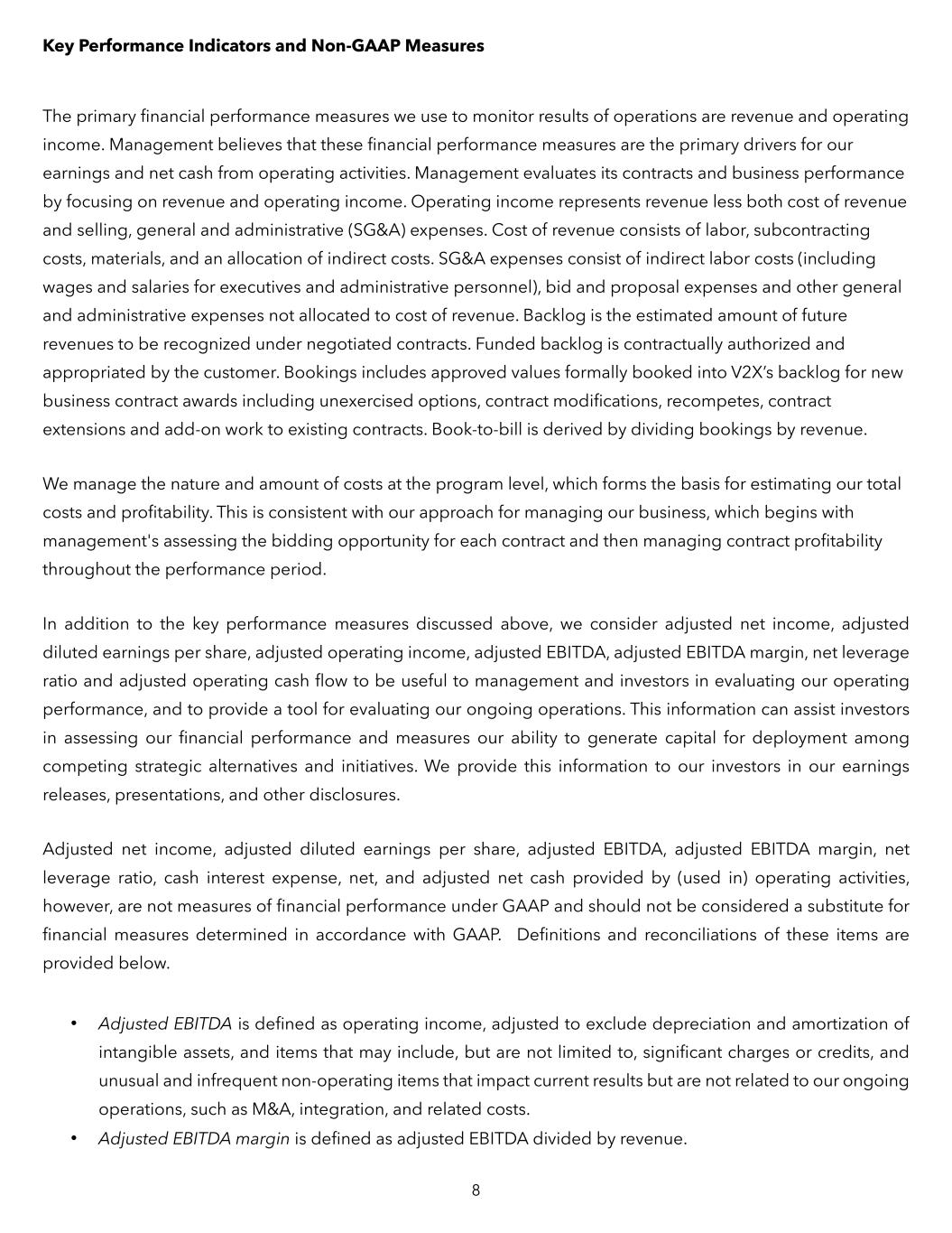 8 Key Performance Indicators and Non-GAAP Measures The primary financial performance measures we use to monitor results of operations are revenue and operating income. Management believes that these financial performance measures are the primary drivers for our earnings and net cash from operating activities. Management evaluates its contracts and business performance by focusing on revenue and operating income. Operating income represents revenue less both cost of revenue and selling, general and administrative (SG&A) expenses. Cost of revenue consists of labor, subcontracting costs, materials, and an allocation of indirect costs. SG&A expenses consist of indirect labor costs (including wages and salaries for executives and administrative personnel), bid and proposal expenses and other general and administrative expenses not allocated to cost of revenue. Backlog is the estimated amount of future revenues to be recognized under negotiated contracts. Funded backlog is contractually authorized and appropriated by the customer. Bookings includes approved values formally booked into V2X’s backlog for new business contract awards including unexercised options, contract modifications, recompetes, contract extensions and add-on work to existing contracts. Book-to-bill is derived by dividing bookings by revenue. We manage the nature and amount of costs at the program level, which forms the basis for estimating our total costs and profitability. This is consistent with our approach for managing our business, which begins with management's assessing the bidding opportunity for each contract and then managing contract profitability throughout the performance period. In addition to the key performance measures discussed above, we consider adjusted net income, adjusted diluted earnings per share, adjusted operating income, adjusted EBITDA, adjusted EBITDA margin, net leverage ratio and adjusted operating cash flow to be useful to management and investors in evaluating our operating performance, and to provide a tool for evaluating our ongoing operations. This information can assist investors in assessing our financial performance and measures our ability to generate capital for deployment among competing strategic alternatives and initiatives. We provide this information to our investors in our earnings releases, presentations, and other disclosures. Adjusted net income, adjusted diluted earnings per share, adjusted EBITDA, adjusted EBITDA margin, net leverage ratio, cash interest expense, net, and adjusted net cash provided by (used in) operating activities, however, are not measures of financial performance under GAAP and should not be considered a substitute for financial measures determined in accordance with GAAP. Definitions and reconciliations of these items are provided below. • Adjusted EBITDA is defined as operating income, adjusted to exclude depreciation and amortization of intangible assets, and items that may include, but are not limited to, significant charges or credits, and unusual and infrequent non-operating items that impact current results but are not related to our ongoing operations, such as M&A, integration, and related costs. • Adjusted EBITDA margin is defined as adjusted EBITDA divided by revenue.