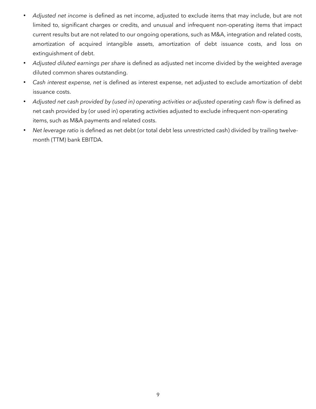 9 • Adjusted net income is defined as net income, adjusted to exclude items that may include, but are not limited to, significant charges or credits, and unusual and infrequent non-operating items that impact current results but are not related to our ongoing operations, such as M&A, integration and related costs, amortization of acquired intangible assets, amortization of debt issuance costs, and loss on extinguishment of debt. • Adjusted diluted earnings per share is defined as adjusted net income divided by the weighted average diluted common shares outstanding. • Cash interest expense, net is defined as interest expense, net adjusted to exclude amortization of debt issuance costs. • Adjusted net cash provided by (used in) operating activities or adjusted operating cash flow is defined as net cash provided by (or used in) operating activities adjusted to exclude infrequent non-operating items, such as M&A payments and related costs. • Net leverage ratio is defined as net debt (or total debt less unrestricted cash) divided by trailing twelve- month (TTM) bank EBITDA.