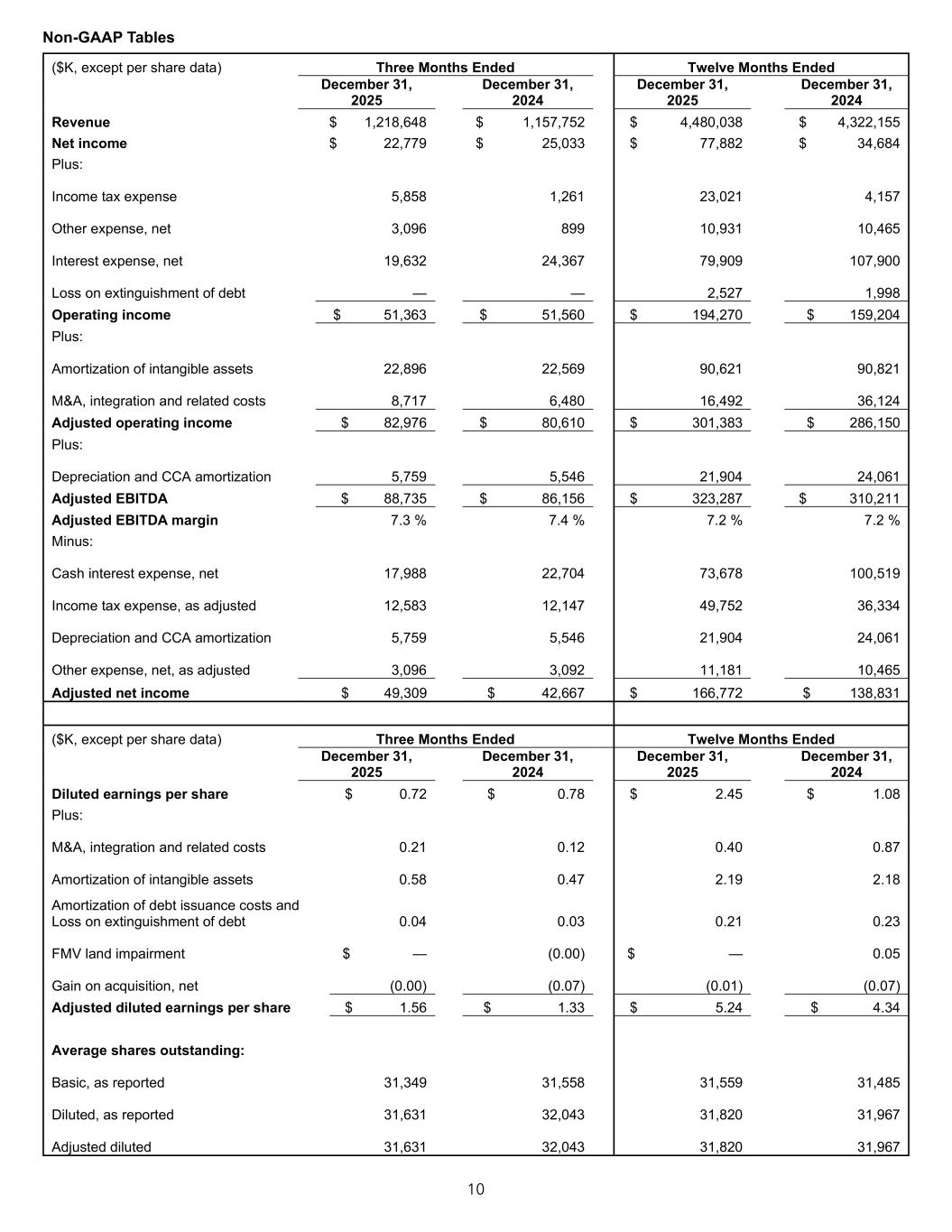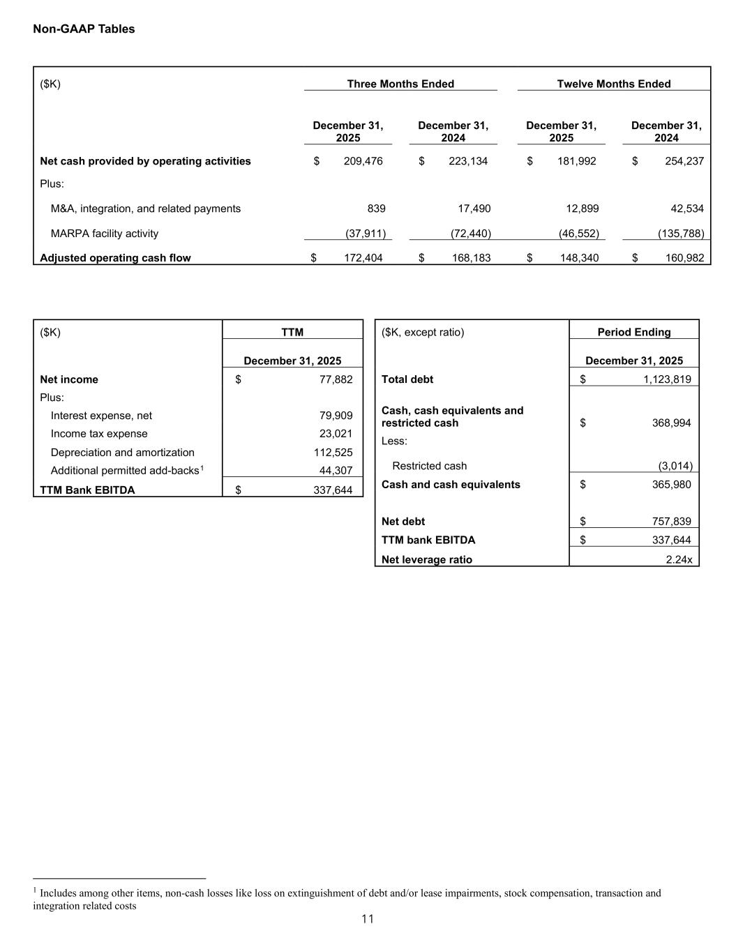 10 Non-GAAP Tables ($K, except per share data) Three Months Ended Twelve Months Ended December 31, 2025 December 31, 2024 December 31, 2025 December 31, 2024 Revenue $ 1,218,648 $ 1,157,752 $ 4,480,038 $ 4,322,155 Net income $ 22,779 $ 25,033 $ 77,882 $ 34,684 Plus: Income tax expense 5,858 1,261 23,021 4,157 Other expense, net 3,096 899 10,931 10,465 Interest expense, net 19,632 24,367 79,909 107,900 Loss on extinguishment of debt — — 2,527 1,998 Operating income $ 51,363 $ 51,560 $ 194,270 $ 159,204 Plus: Amortization of intangible assets 22,896 22,569 90,621 90,821 M&A, integration and related costs 8,717 6,480 16,492 36,124 Adjusted operating income $ 82,976 $ 80,610 $ 301,383 $ 286,150 Plus: Depreciation and CCA amortization 5,759 5,546 21,904 24,061 Adjusted EBITDA $ 88,735 $ 86,156 $ 323,287 $ 310,211 Adjusted EBITDA margin 7.3 % 7.4 % 7.2 % 7.2 % Minus: Cash interest expense, net 17,988 22,704 73,678 100,519 Income tax expense, as adjusted 12,583 12,147 49,752 36,334 Depreciation and CCA amortization 5,759 5,546 21,904 24,061 Other expense, net, as adjusted 3,096 3,092 11,181 10,465 Adjusted net income $ 49,309 $ 42,667 $ 166,772 $ 138,831 ($K, except per share data) Three Months Ended Twelve Months Ended December 31, 2025 December 31, 2024 December 31, 2025 December 31, 2024 Diluted earnings per share $ 0.72 $ 0.78 $ 2.45 $ 1.08 Plus: M&A, integration and related costs 0.21 0.12 0.40 0.87 Amortization of intangible assets 0.58 0.47 2.19 2.18 Amortization of debt issuance costs and Loss on extinguishment of debt 0.04 0.03 0.21 0.23 FMV land impairment $ — (0.00) $ — 0.05 Gain on acquisition, net (0.00) (0.07) (0.01) (0.07) Adjusted diluted earnings per share $ 1.56 $ 1.33 $ 5.24 $ 4.34 Average shares outstanding: Basic, as reported 31,349 31,558 31,559 31,485 Diluted, as reported 31,631 32,043 31,820 31,967 Adjusted diluted 31,631 32,043 31,820 31,967