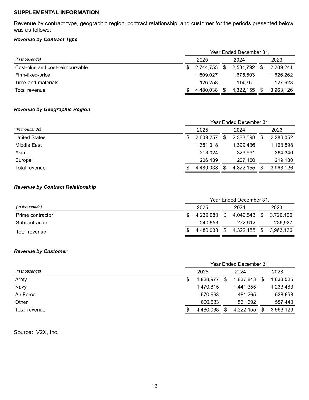 12 SUPPLEMENTAL INFORMATION Revenue by contract type, geographic region, contract relationship, and customer for the periods presented below was as follows: Revenue by Contract Type Year Ended December 31, (In thousands) 2025 2024 2023 Cost-plus and cost-reimbursable $ 2,744,753 $ 2,531,792 $ 2,209,241 Firm-fixed-price 1,609,027 1,675,603 1,626,262 Time-and-materials 126,258 114,760 127,623 Total revenue $ 4,480,038 $ 4,322,155 $ 3,963,126 Revenue by Geographic Region Year Ended December 31, (In thousands) 2025 2024 2023 United States $ 2,609,257 $ 2,388,598 $ 2,286,052 Middle East 1,351,318 1,399,436 1,193,598 Asia 313,024 326,961 264,346 Europe 206,439 207,160 219,130 Total revenue $ 4,480,038 $ 4,322,155 $ 3,963,126 Revenue by Contract Relationship Year Ended December 31, (In thousands) 2025 2024 2023 Prime contractor $ 4,239,080 $ 4,049,543 $ 3,726,199 Subcontractor 240,958 272,612 236,927 Total revenue $ 4,480,038 $ 4,322,155 $ 3,963,126 Revenue by Customer Year Ended December 31, (In thousands) 2025 2024 2023 Army $ 1,828,977 $ 1,837,843 $ 1,633,525 Navy 1,479,815 1,441,355 1,233,463 Air Force 570,663 481,265 538,698 Other 600,583 561,692 557,440 Total revenue $ 4,480,038 $ 4,322,155 $ 3,963,126 Source: V2X, Inc.