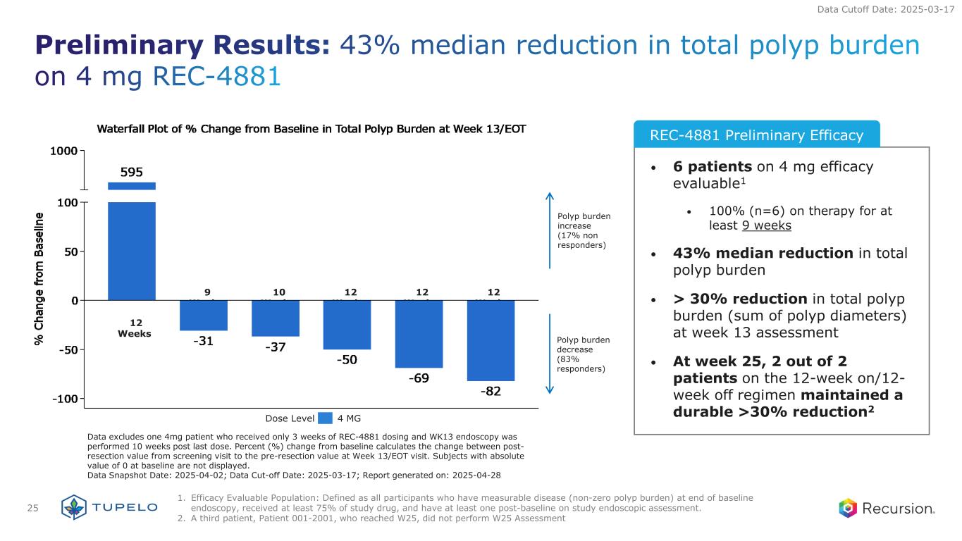 REC-4881 Preliminary Safety Event, n (%) Placebo (N=2) REC-4881 4 mg (N=16)3 REC-4881 8 mg (N=3) REC-4881 Total (N=19) Any Treatment Emergent Adverse Event (TEAE) 2 (100) 13 (81.2) 3 (100) 16 (84.2) TEAEs Grade ≥3 0 5 (31.2) 0 5 (26.3) Any TEAE related to study drug (TRAE) 1 (50.0) 13 (81.2) 2 (66.7) 15 (78.9) Grade ≥3 TRAE 0 3 (18.8) 0 3 (15.8) Discontinuation due to Related-TEAE 0 3 (18.8) 0 3 (15.8) Dose interruption due to Related-TEAE 0 1 (6.20) 0 1 (5.3) Dose modification due to Related-TEAE NA 02 1 (33.3) 1 (5.3) 4 mg dose: • Most common TRAEs: dermatitis acneiform (50%; All G1/2), rash (31.2%; 25% G1/2 and 6% G3), diarrhea (31.2%; All G1/2), blood CPK increase (25%; All G1/2), and LVEF decrease (25%; 19% G1/2, 6% G3) • Grade 3 TRAEs: Rash (6%, n=1), CRP increase (6%, n=1), LVEF Decrease (6%, n=1)1 8 mg dose: • No Grade 3 TRAEs • Grade 2 TRAEs: Rash (33%, n=1) Data Cutoff Date: 2025-03-17 24 1. LVEF decrease was transient, and patient recovered following drug withdrawal 2. 4 mg is the lowest dose available in this Study 3. For 4mg, N=5 patients in Phase 1b and N=11 patients in Phase 2 were dosed