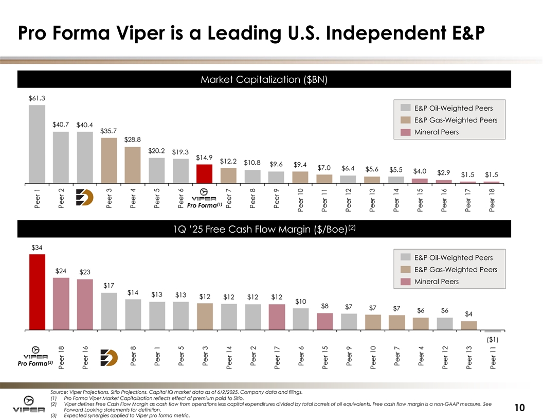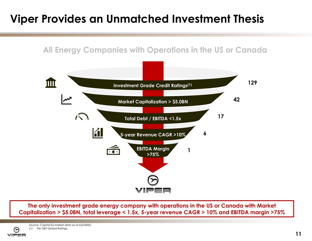 Pro Forma Viper is a Leading U.S. Independent E&P Market Capi Market Capitali talizati zation on ( ($ $BN) BN) E&P Oil-Weighted Peers E&P Gas-Weighted Peers Mineral Peers (1) Pro Forma (2 (2) ) 1Q ’25 1Q ’25 Free Cash Flow Free Cash Flow Margi Margin n ( ($ $/Boe) /Boe) E&P Oil-Weighted Peers E&P Gas-Weighted Peers Mineral Peers (3) Pro Forma Source: Viper Projections. Sitio Projections. Capital IQ market data as of 6/2/2025. Company data and filings. (1) Pro Forma Viper Market Capitalization reflects effect of premium paid to Sitio. (2) Viper defines Free Cash Flow Margin as cash flow from operations less capital expenditures divided by total barrels of oil equivalents. Free cash flow margin is a non-GAAP measure. See 10 Forward Looking statements for definition. (3) Expected synergies applied to Viper pro forma metric.