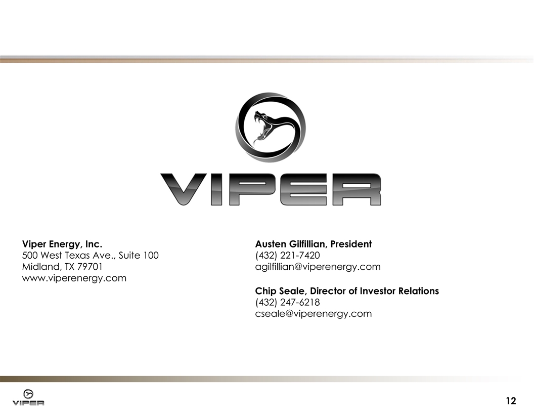 Viper Energy, Inc. Austen Gilfillian, President 500 West Texas Ave., Suite 100 (432) 221-7420 Midland, TX 79701 agilfillian@viperenergy.com www.viperenergy.com Chip Seale, Director of Investor Relations (432) 247-6218 cseale@viperenergy.com 12