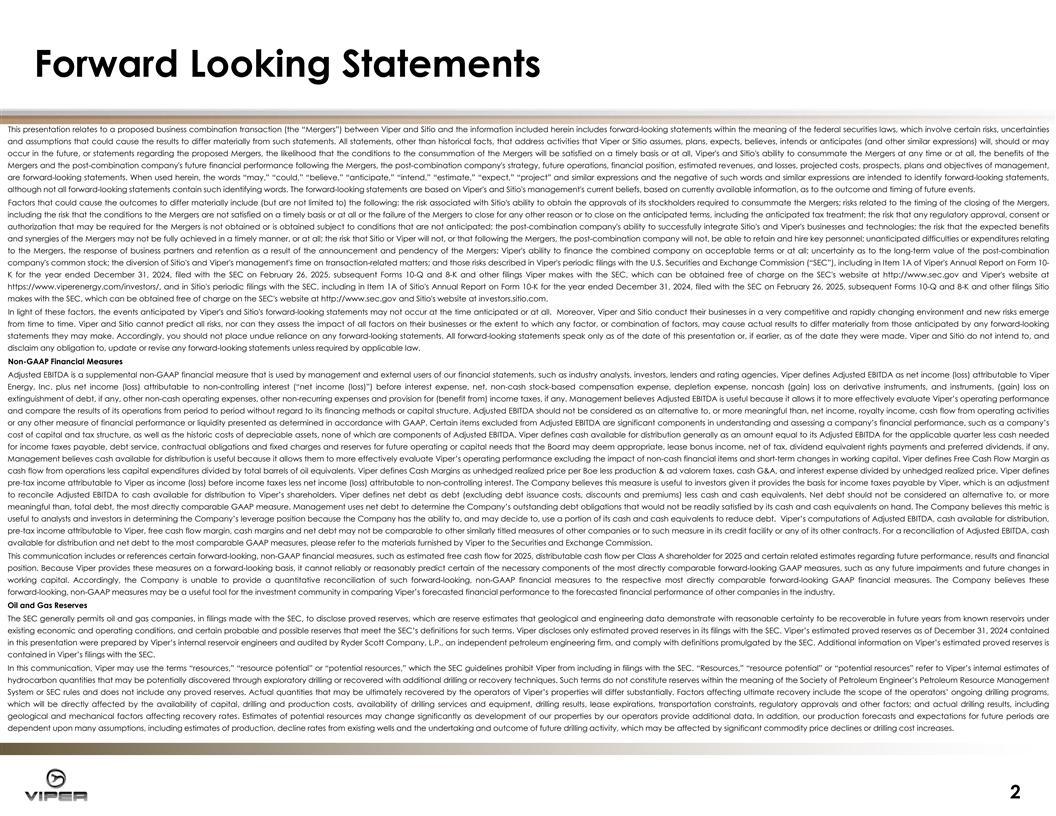 Forward Looking Statements This presentation relates to a proposed business combination transaction (the “Mergers”) between Viper and Sitio and the information included herein includes forward-looking statements within the meaning of the federal securities laws, which involve certain risks, uncertainties and assumptions that could cause the results to differ materially from such statements. All statements, other than historical facts, that address activities that Viper or Sitio assumes, plans, expects, believes, intends or anticipates (and other similar expressions) will, should or may occur in the future, or statements regarding the proposed Mergers, the likelihood that the conditions to the consummation of the Mergers will be satisfied on a timely basis or at all, Viper's and Sitio's ability to consummate the Mergers at any time or at all, the benefits of the Mergers and the post-combination company's future financial performance following the Mergers, the post-combination company's strategy, future operations, financial position, estimated revenues, and losses, projected costs, prospects, plans and objectives of management, are forward-looking statements. When used herein, the words “may,” “could,” “believe,” “anticipate,” “intend,” “estimate,” “expect,” “project” and similar expressions and the negative of such words and similar expressions are intended to identify forward-looking statements, although not all forward-looking statements contain such identifying words. The forward-looking statements are based on Viper's and Sitio's management's current beliefs, based on currently available information, as to the outcome and timing of future events. Factors that could cause the outcomes to differ materially include (but are not limited to) the following: the risk associated with Sitio's ability to obtain the approvals of its stockholders required to consummate the Mergers; risks related to the timing of the closing of the Mergers, including the risk that the conditions to the Mergers are not satisfied on a timely basis or at all or the failure of the Mergers to close for any other reason or to close on the anticipated terms, including the anticipated tax treatment; the risk that any regulatory approval, consent or authorization that may be required for the Mergers is not obtained or is obtained subject to conditions that are not anticipated; the post-combination company's ability to successfully integrate Sitio's and Viper's businesses and technologies; the risk that the expected benefits and synergies of the Mergers may not be fully achieved in a timely manner, or at all; the risk that Sitio or Viper will not, or that following the Mergers, the post-combination company will not, be able to retain and hire key personnel; unanticipated difficulties or expenditures relating to the Mergers, the response of business partners and retention as a result of the announcement and pendency of the Mergers; Viper's ability to finance the combined company on acceptable terms or at all; uncertainty as to the long-term value of the post-combination company's common stock; the diversion of Sitio's and Viper's management's time on transaction-related matters; and those risks described in Viper's periodic filings with the U.S. Securities and Exchange Commission (“SEC”), including in Item 1A of Viper's Annual Report on Form 10- K for the year ended December 31, 2024, filed with the SEC on February 26, 2025, subsequent Forms 10-Q and 8-K and other filings Viper makes with the SEC, which can be obtained free of charge on the SEC's website at http://www.sec.gov and Viper's website at https://www.viperenergy.com/investors/, and in Sitio's periodic filings with the SEC, including in Item 1A of Sitio's Annual Report on Form 10-K for the year ended December 31, 2024, filed with the SEC on February 26, 2025, subsequent Forms 10-Q and 8-K and other filings Sitio makes with the SEC, which can be obtained free of charge on the SEC's website at http://www.sec.gov and Sitio's website at investors.sitio.com. In light of these factors, the events anticipated by Viper's and Sitio's forward-looking statements may not occur at the time anticipated or at all. Moreover, Viper and Sitio conduct their businesses in a very competitive and rapidly changing environment and new risks emerge from time to time. Viper and Sitio cannot predict all risks, nor can they assess the impact of all factors on their businesses or the extent to which any factor, or combination of factors, may cause actual results to differ materially from those anticipated by any forward-looking statements they may make. Accordingly, you should not place undue reliance on any forward-looking statements. All forward-looking statements speak only as of the date of this presentation or, if earlier, as of the date they were made. Viper and Sitio do not intend to, and disclaim any obligation to, update or revise any forward-looking statements unless required by applicable law. Non-GAAP Financial Measures Adjusted EBITDA is a supplemental non-GAAP financial measure that is used by management and external users of our financial statements, such as industry analysts, investors, lenders and rating agencies. Viper defines Adjusted EBITDA as net income (loss) attributable to Viper Energy, Inc. plus net income (loss) attributable to non-controlling interest (“net income (loss)”) before interest expense, net, non-cash stock-based compensation expense, depletion expense, noncash (gain) loss on derivative instruments, and instruments, (gain) loss on extinguishment of debt, if any, other non-cash operating expenses, other non-recurring expenses and provision for (benefit from) income taxes, if any. Management believes Adjusted EBITDA is useful because it allows it to more effectively evaluate Viper’s operating performance and compare the results of its operations from period to period without regard to its financing methods or capi