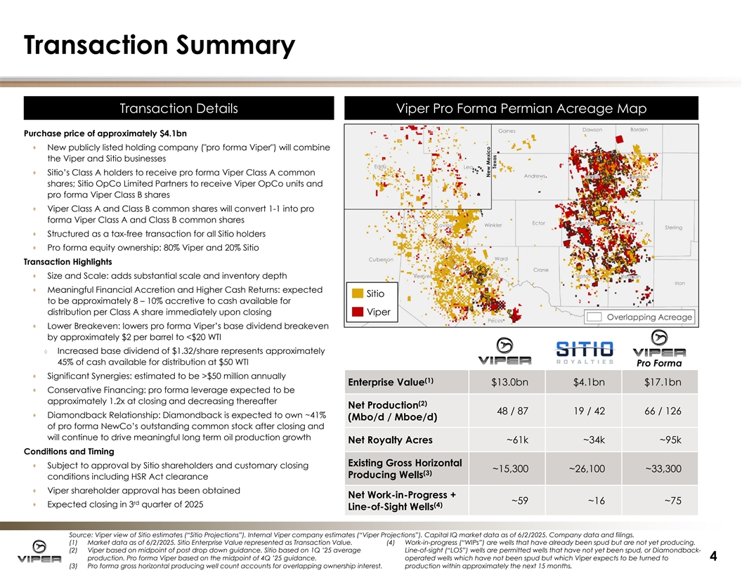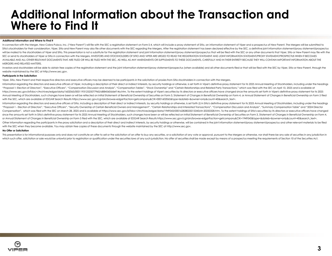 Additional Information about the Transaction and Where to Find It Additional Information and Where to Find It In connection with the Merger, New Cobra Pubco, Inc. (“New Parent”) will file with the SEC a registration statement on Form S-4, which will include a proxy statement of Sitio, an information statement of Viper and a prospectus of New Parent. The Mergers will be submitted to Sitio's stockholders for their consideration. Viper, Sitio and New Parent may also file other documents with the SEC regarding the Mergers. After the registration statement has been declared effective by the SEC, a definitive joint information statement/proxy statement/prospectus will be mailed to the stockholders of Viper and Sitio. This presentation is not a substitute for the registration statement and joint information statement/proxy statement/prospectus that will be filed with the SEC or any other documents that Viper, Sitio or New Parent may file with the SEC or send to stockholders of Viper or Sitio in connection with the Mergers. INVESTORS AND STOCKHOLDERS OF SITIO AND VIPER ARE URGED TO READ THE REGISTRATION STATEMENT AND JOINT INFORMATION STATEMENT/PROXY STATEMENT/PROSPECTUS WHEN IT BECOMES AVAILABLE AND ALL OTHER RELEVANT DOCUMENTS THAT ARE FILED OR WILL BE FILED WITH THE SEC, AS WELL AS ANY AMENDMENTS OR SUPPLEMENTS TO THESE DOCUMENTS, CAREFULLY AND IN THEIR ENTIRETY BECAUSE THEY WILL CONTAIN IMPORTANT INFORMATION ABOUT THE MERGERS AND RELATED MATTERS. Investors and stockholders will be able to obtain free copies of the registration statement and the joint information statement/proxy statement/prospectus (when available) and all other documents filed or that will be filed with the SEC by Viper, Sitio or New Parent, through the website maintained by the SEC at http://www.sec.gov. Participants in the Solicitation Viper, Sitio, New Parent and their respective directors and executive officers may be deemed to be participants in the solicitation of proxies from Sitio stockholders in connection with the Mergers. Information regarding the directors and executive officers of Viper, including a description of their direct or indirect interests, by security holdings or otherwise, is set forth in Viper's definitive proxy statement for its 2025 Annual Meeting of Stockholders, including under the headings “Proposal 1: Election of Directors”, “Executive Officers”, “Compensation Discussion and Analysis”, “Compensation Tables”, “Stock Ownership” and “Certain Relationships and Related Party Transactions,” which was filed with the SEC on April 10, 2025 and is available at https://www.sec.gov/ix?doc=/Archives/edgar/data/1602065/000119312525077960/d884560ddef14a.htm. To the extent holdings of Viper's securities by its directors or executive officers have changed since the amounts set forth in Viper's definitive proxy statement for its 2025 Annual Meeting of Stockholders, such changes have been or will be reflected on Initial Statement of Beneficial Ownership of Securities on Form 3, Statement of Changes in Beneficial Ownership on Form 4, or Annual Statement of Changes in Beneficial Ownership on Form 5 filed with the SEC, which are available at EDGAR Search Results https://www.sec.gov/cgi-bin/browse-edgar?action=getcompany&CIK=0001602065&type=&dateb=&owner=only&count=40&search_text=. Information regarding the directors and executive officers of Sitio, including a description of their direct or indirect interests, by security holdings or otherwise, is set forth (i) in Sitio's definitive proxy statement for its 2025 Annual Meeting of Stockholders, including under the headings “Proposal 1 - Election of Directors”, “Executive Officers”, “Security Ownership of Certain Beneficial Owners and Management”, “Certain Relationships and Interested Transactions”, “Compensation Discussion and Analysis”, “Summary Compensation Table” and “2024 Director Compensation”, which was filed with the SEC on March 28, 2025 and is available at https://www.sec.gov/ix?doc=/Archives/edgar/data/1949543/000162828025015343/str-20250328.htm. To the extent holdings of Sitio's securities by its directors or executive officers have changed since the amounts set forth in Sitio's definitive proxy statement for its 2025 Annual Meeting of Stockholders, such changes have been or will be reflected on Initial Statement of Beneficial Ownership of Securities on Form 3, Statement of Changes in Beneficial Ownership on Form 4, or Annual Statement of Changes in Beneficial Ownership on Form 5 filed with the SEC, which are available at EDGAR Search Results https://www.sec.gov/cgi-bin/browse-edgar?action=getcompany&CIK=1949543&type=&dateb=&owner=only&count=40&search_text=. Other information regarding the participants in the proxy solicitation and a description of their direct and indirect interests, by security holdings or otherwise, will be contained in the joint information statement/proxy statement/prospectus and other relevant materials to be filed with the SEC when they become available. You may obtain free copies of these documents through the website maintained by the SEC at http://www.sec.gov. No Offer or Solicitation This presentation is for informational purposes only and does not constitute an offer to sell or the solicitation of an offer to buy any securities, or a solicitation of any vote or approval, pursuant to the Mergers or otherwise, nor shall there be any sale of securities in any jurisdiction in which such offer, solicitation or sale would be unlawful prior to registration or qualification under the securities laws of any such jurisdiction. No offer of securities shall be made except by means of a prospectus meeting the requirements of Section 10 of the Securities Act. 3