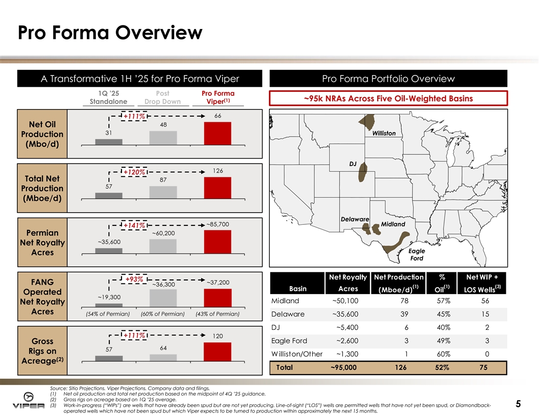 Transaction Summary T Tr ra an ns sa act ction ion D De et ta ails ils Vi Viper Pro Forma Permi per Pro Forma Permia an Acreage n Acreage Map Map Purchase price of approximately $4.1bn · New publicly listed holding company ( pro forma Viper ) will combine the Viper and Sitio businesses · Sitio’s Class A holders to receive pro forma Viper Class A common shares; Sitio OpCo Limited Partners to receive Viper OpCo units and pro forma Viper Class B shares · Viper Class A and Class B common shares will convert 1-1 into pro forma Viper Class A and Class B common shares · Structured as a tax-free transaction for all Sitio holders · Pro forma equity ownership: 80% Viper and 20% Sitio Transaction Highlights · Size and Scale: adds substantial scale and inventory depth · Meaningful Financial Accretion and Higher Cash Returns: expected Sitio to be approximately 8 – 10% accretive to cash available for distribution per Class A share immediately upon closing Viper · Lower Breakeven: lowers pro forma Viper’s base dividend breakeven by approximately $2 per barrel to <$20 WTI ◊ Increased base dividend of $1.32/share represents approximately 45% of cash available for distribution at $50 WTI Pro Forma · Significant Synergies: estimated to be >$50 million annually (1) Enterprise Value $13.0bn $4.1bn $17.1bn · Conservative Financing: pro forma leverage expected to be approximately 1.2x at closing and decreasing thereafter (2) Net Production 48 / 87 19 / 42 66 / 126 · Diamondback Relationship: Diamondback is expected to own ~41% (Mbo/d / Mboe/d) of pro forma NewCo’s outstanding common stock after closing and will continue to drive meaningful long term oil production growth Net Royalty Acres ~61k ~34k ~95k Conditions and Timing Existing Gross Horizontal · Subject to approval by Sitio shareholders and customary closing ~15,300 ~26,100 ~33,300 (3) Producing Wells conditions including HSR Act clearance · Viper shareholder approval has been obtained Net Work-in-Progress + rd ~59 ~16 ~75 · Expected closing in 3 quarter of 2025 (4) Line-of-Sight Wells Source: Viper view of Sitio estimates (“Sitio Projections”). Internal Viper company estimates (“Viper Projections”). Capital IQ market data as of 6/2/2025. Company data and filings. (1) Market data as of 6/2/2025. Sitio Enterprise Value represented as Transaction Value. (4) Work-in-progress (“WIPs”) are wells that have already been spud but are not yet producing. (2) Viper based on midpoint of post drop down guidance. Sitio based on 1Q ’25 average Line-of-sight (“LOS”) wells are permitted wells that have not yet been spud, or Diamondback- production. Pro forma Viper based on the midpoint of 4Q ’25 guidance. operated wells which have not been spud but which Viper expects to be turned to 4 (3) Pro forma gross horizontal producing well count accounts for overlapping ownership interest. production within approximately the next 15 months.
