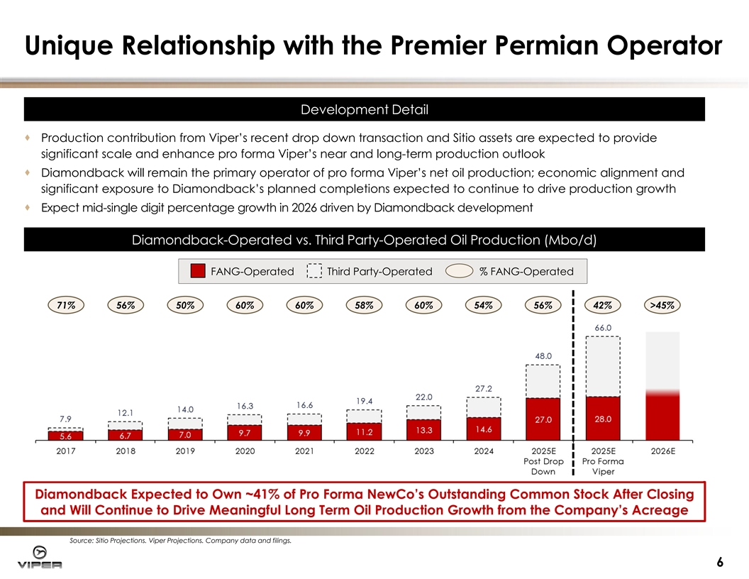 Pro Forma Overview A Transformati A Transformative 1H ’25 ve 1H ’25 for Pro for Pro Forma Vi Forma Viper per Pro Forma Portfolio Pro Forma Portfolio Overvi Overview ew 1Q ’25 Post Pro Forma ~95k NRAs Across Five Oil-Weighted Basins (1) Standalone Drop Down Viper +111% Net Oil Williston Production (Mbo/d) DJ +120% Total Net Production (Mboe/d) Delaware Midland +141% Permian Net Royalty Eagle Acres Ford Net Royalty Net Production % Net WIP + +93% FANG (1) (1) (3) Basin Acres (Mboe/d) Oil LOS Wells Operated Midland ~50,100 78 57% 56 Net Royalty Acres (54% of Permian) (60% of Permian) (43% of Permian) Delaware ~35,600 39 45% 15 DJ ~5,400 6 40% 2 +111% Eagle Ford ~2,600 3 49% 3 Gross Rigs on Williston/Other ~1,300 1 60% 0 (2) Acreage Total ~95,000 126 52% 75 Source: Sitio Projections. Viper Projections. Company data and filings. (1) Net oil production and total net production based on the midpoint of 4Q ’25 guidance. (2) Gross rigs on acreage based on 1Q ’25 average. (3) Work-in-progress (“WIPs”) are wells that have already been spud but are not yet producing. Line-of-sight (“LOS”) wells are permitted wells that have not yet been spud, or Diamondback- 5 operated wells which have not been spud but which Viper expects to be turned to production within approximately the next 15 months.