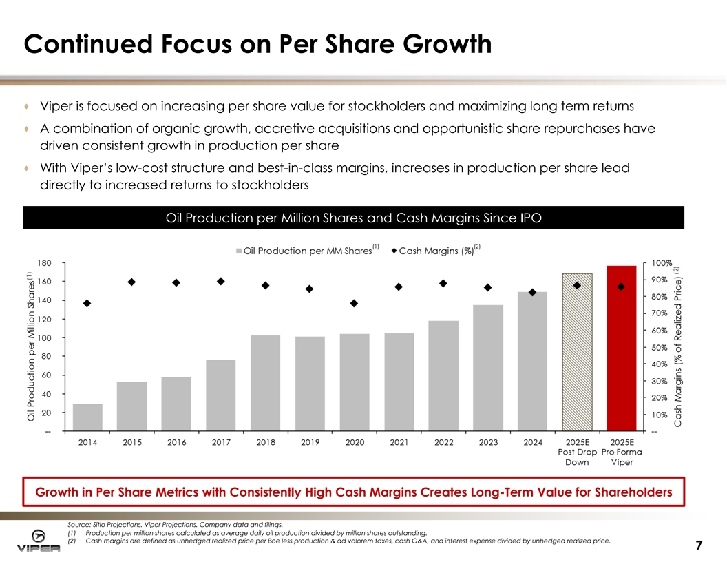 Unique Relationship with the Premier Permian Operator Development Development D De et ta aiill · Production contribution from Viper’s recent drop down transaction and Sitio assets are expected to provide significant scale and enhance pro forma Viper’s near and long-term production outlook · Diamondback will remain the primary operator of pro forma Viper’s net oil production; economic alignment and significant exposure to Diamondback’s planned completions expected to continue to drive production growth · Expect mid-single digit percentage growth in 2026 driven by Diamondback development Diamondback-O Diamondback-Op pe er ra at te ed d vs. vs. Third Third Party-Operated O Party-Operated Oiill P Pr ro od du uc ct tiio on n ( (Mbo/d) Mbo/d) FANG-Operated Third Party-Operated % FANG-Operated 71% 56% 50% 60% 60% 58% 60% 54% 56% 42% >45% Diamondback Expected to Own ~41% of Pro Forma NewCo’s Outstanding Common Stock After Closing and Will Continue to Drive Meaningful Long Term Oil Production Growth from the Company’s Acreage Source: Sitio Projections. Viper Projections. Company data and filings. 6