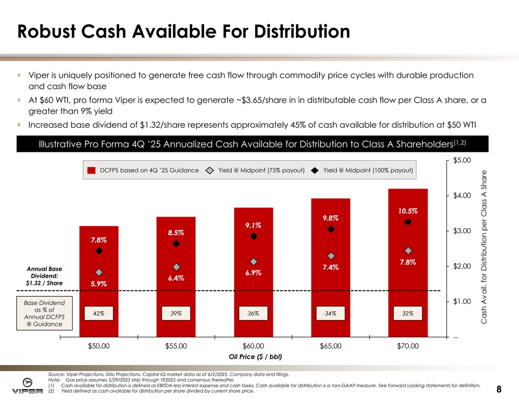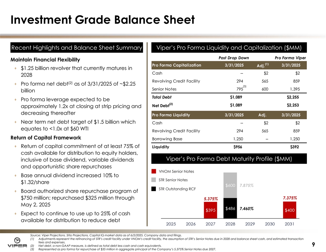 Robust Cash Available For Distribution · Viper is uniquely positioned to generate free cash flow through commodity price cycles with durable production and cash flow base · At $60 WTI, pro forma Viper is expected to generate ~$3.65/share in in distributable cash flow per Class A share, or a greater than 9% yield · Increased base dividend of $1.32/share represents approximately 45% of cash available for distribution at $50 WTI (1 (1, ,2 2) ) Illustrati Illustrative ve Pro Forma 4Q ’25 Annuali Pro Forma 4Q ’25 Annualiz zed Cash Av ed Cash Avai ailable for Di lable for Distribution stribution to Class A to Class A Shareholders Shareholders DCFPS based on 4Q ’25 Guidance Yield @ Midpoint (75% payout) Yield @ Midpoint (100% payout) Annual Base Dividend: $1.32 / Share Base Dividend as % of 42% 39% 36% 34% 32% Annual DCFPS @ Guidance Oil Price ($ / bbl) Source: Viper Projections. Sitio Projections. Capital IQ market data as of 6/2/2025. Company data and filings. Note: Gas price assumes 5/29/2025 strip through YE2025 and consensus thereafter. (1) Cash available for distribution is defined as EBITDA less interest expense and cash taxes. Cash available for distribution is a non-GAAP measure. See Forward Looking statements for definition. (2) Yield defined as cash available for distribution per share divided by current share price. 8