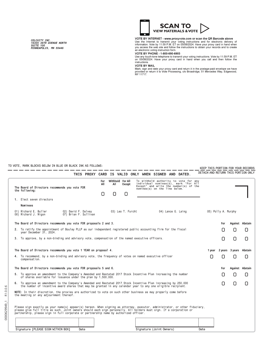 | 2. | To ratify the appointment of Boulay PLLP as Celcuity’s independent registered public accounting firm for the year ending December 31, 2024; |