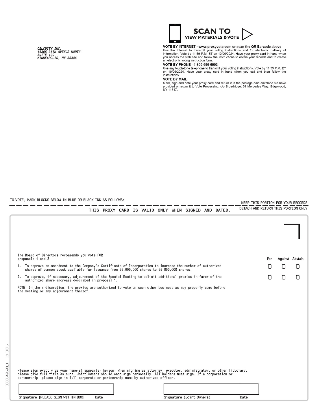 Your vote is important. To vote your shares, please vote by telephone or Internet, as directed in the Proxy Statement, or, if you received a copy of the proxy card or voting instruction form by mail, please complete, sign, date and mail the proxy card or voting instruction form promptly in the envelope provided. The prompt return of proxies will save Celcuity the expense of further requests for proxies.