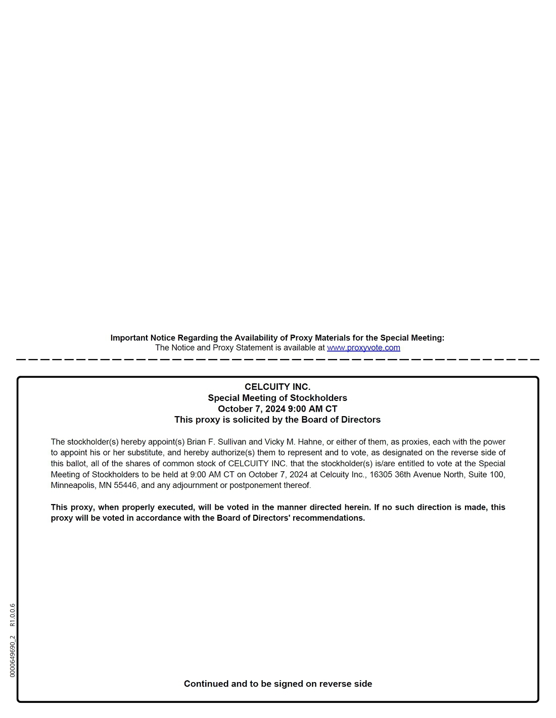 Please Take Notice that Celcuity Inc. (“Celcuity”) will hold a Special Meeting of Stockholders (the “Special Meeting”) at the offices of Celcuity Inc., 16305 36th Avenue North, Suite 100, Minneapolis, MN 55446, on October 7, 2024 at 9:00 a.m. local time. Celcuity is holding this meeting for the purpose of considering and taking appropriate action with respect to the following: